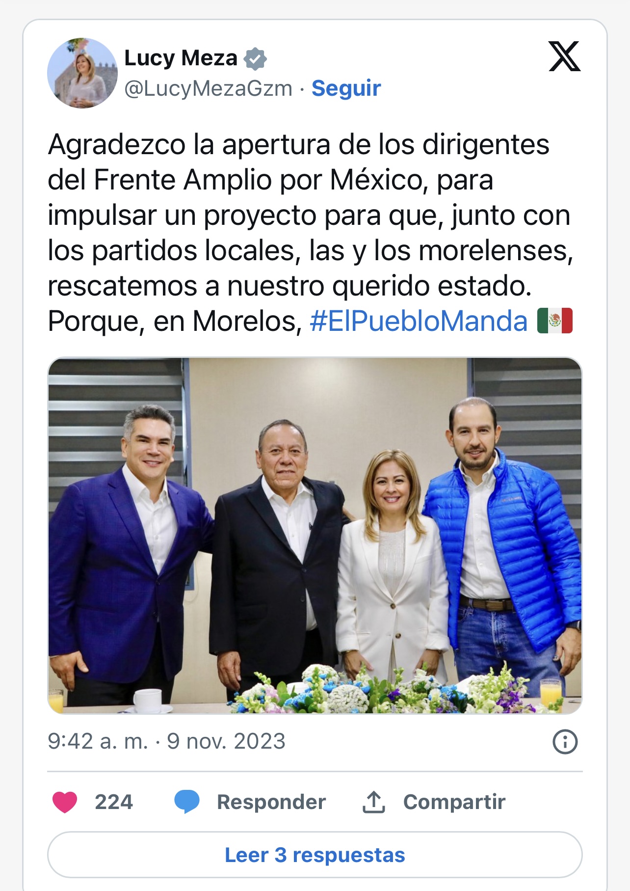 “Agradezco la apertura de los dirigentes del Frente Amplio por México, para impulsar un proyecto para que, junto con los partidos locales, las y los morelenses, rescatemos a nuestro querido estado. Porque, en Morelos, el pueblo manda”, escribió.
