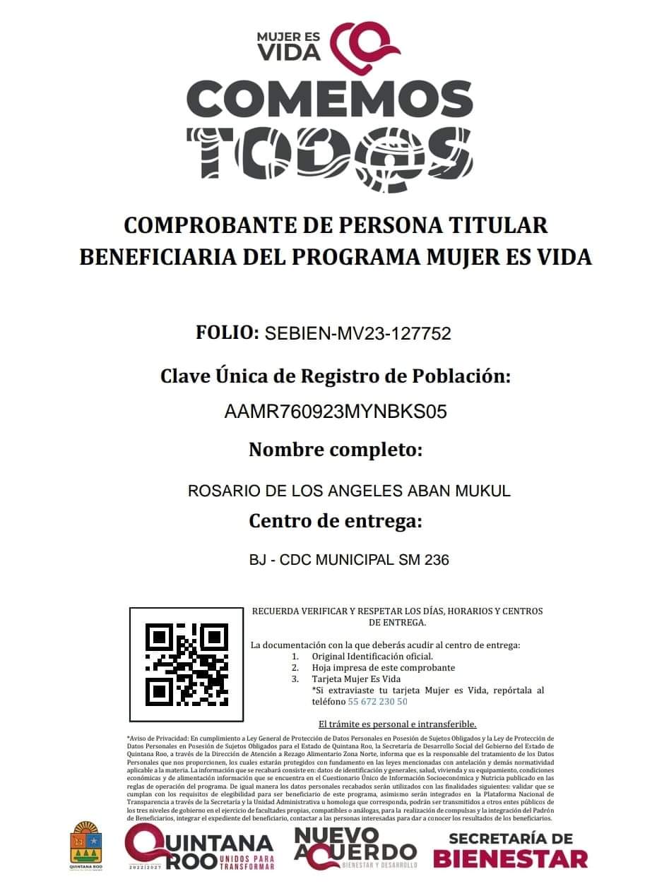 El documento indica que la funcionaria Aban Mukul tiene activa su tarjeta “Mujer es vida”, en la que le depositan mil 200 pesos mensuales, mientras que en el segundo mes se le otorga la despensa “Comemos todas” que contiene productos de la canasta básica, beneficio que se les brinda a todas las mujeres inscritas en el programa social y se pretende llegue 50 mil en toda la entidad.