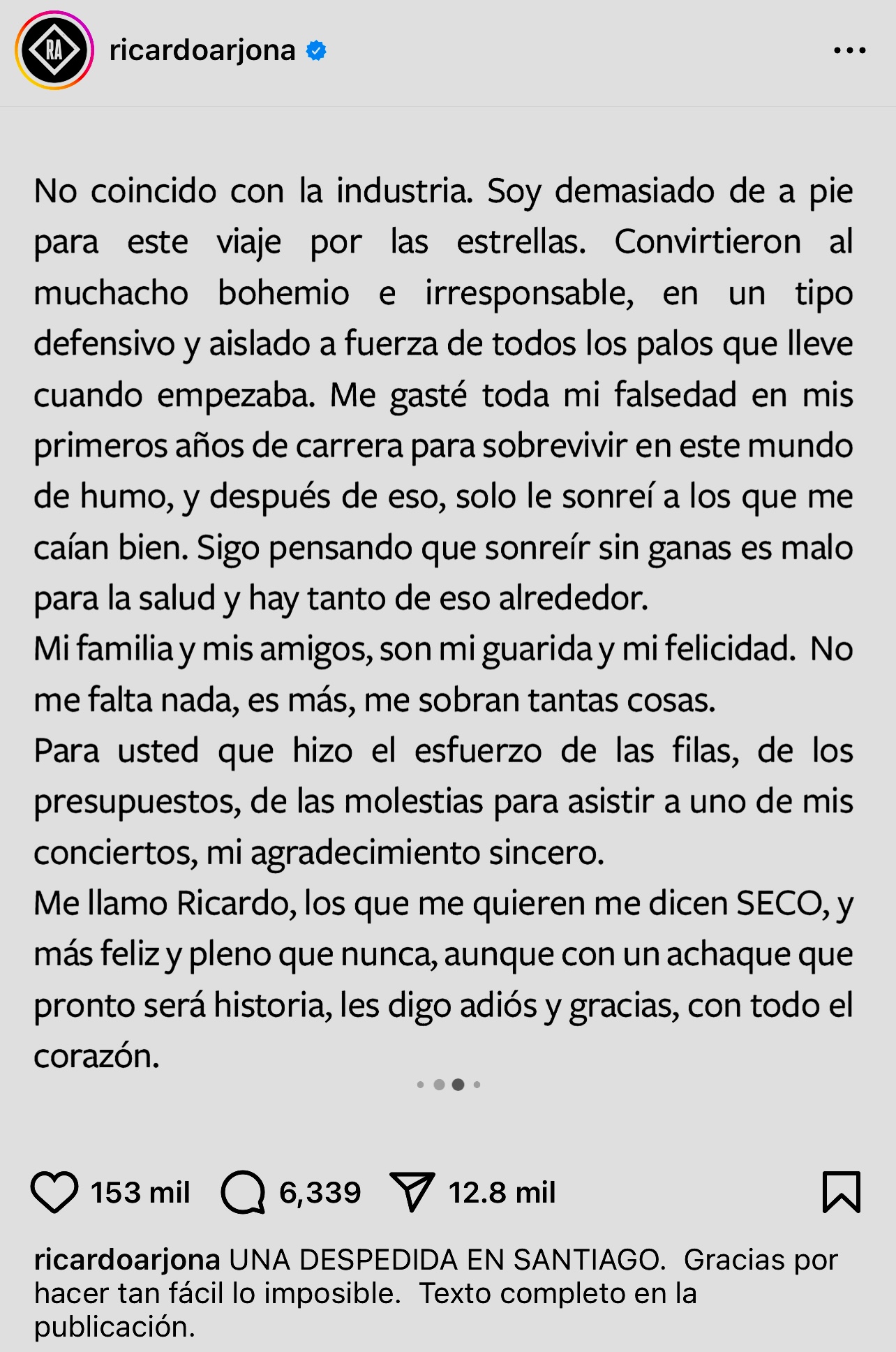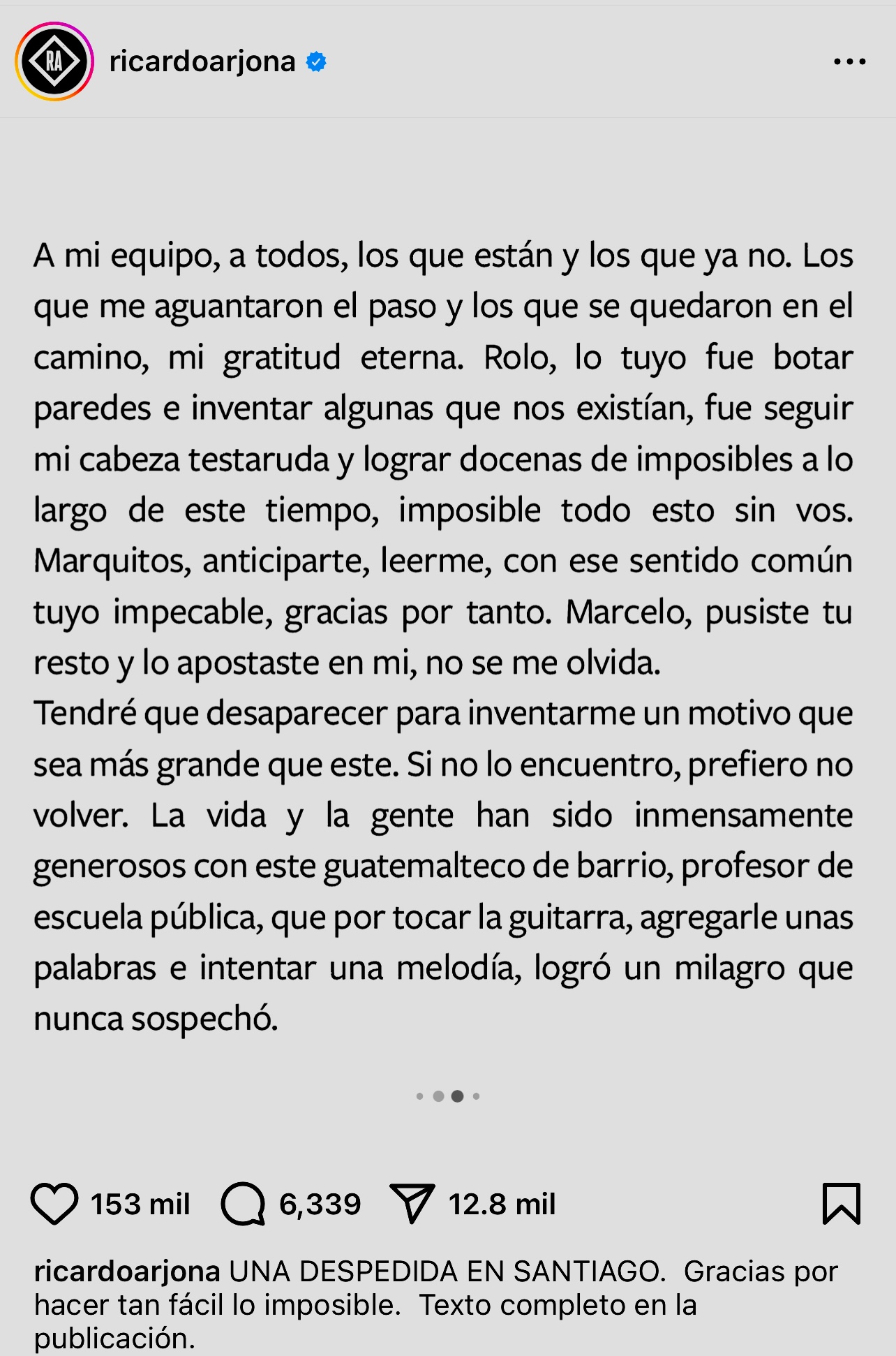 El cantante y compositor Ricardo Arjona no pudo más y anunció su retiro de los escenarios, sin fecha de regreso, obligado por una crisis en su organismo.