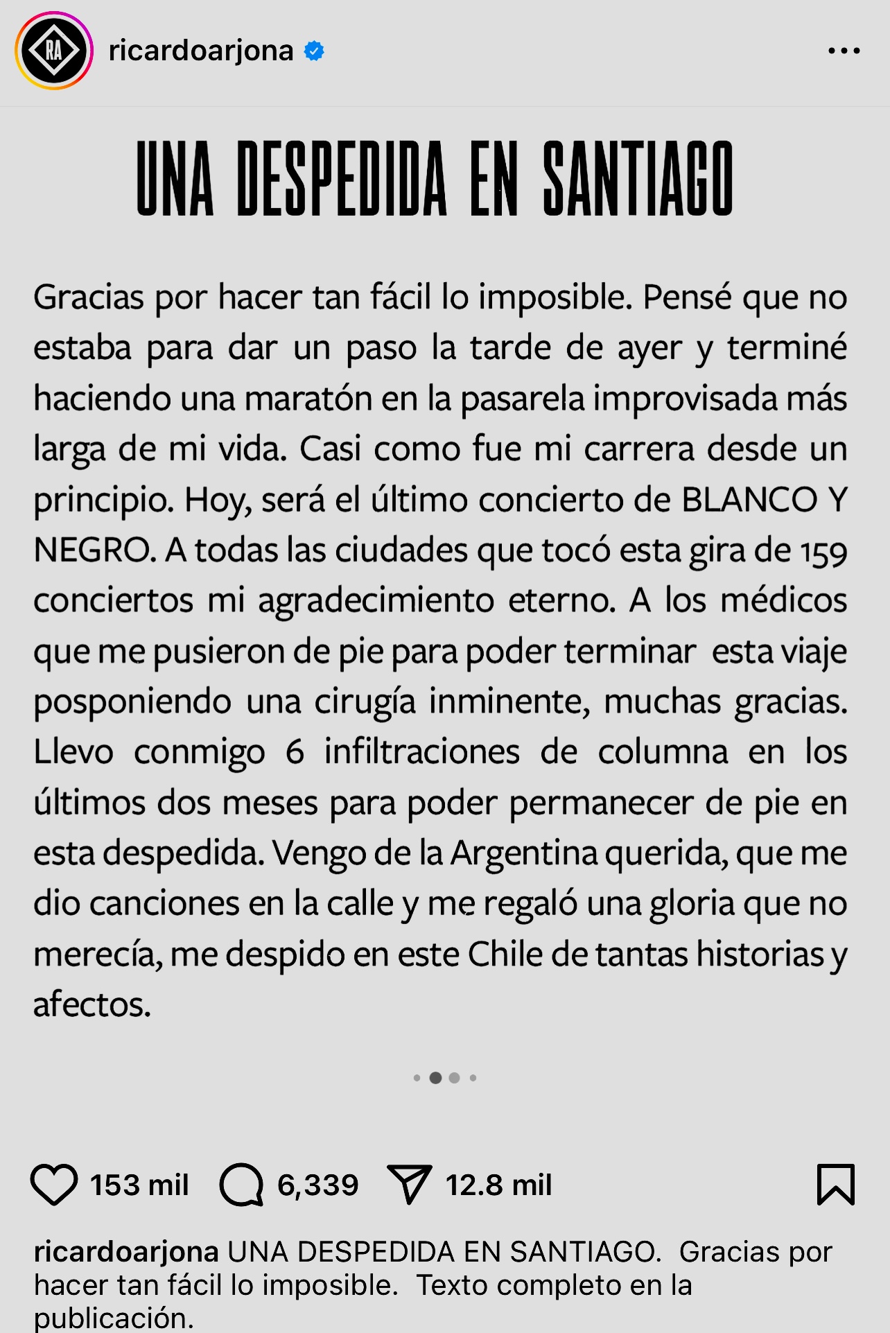 El guatemalteco, quien finalizó la gira “Blanco y Negro“, mencionó lo difícil que le ha sido “poder terminar de pie con esta despedida”, anunciando que lo en los últimos dos meses lleva seis infiltraciones de columna y “posponiendo una cirugía inminente”.