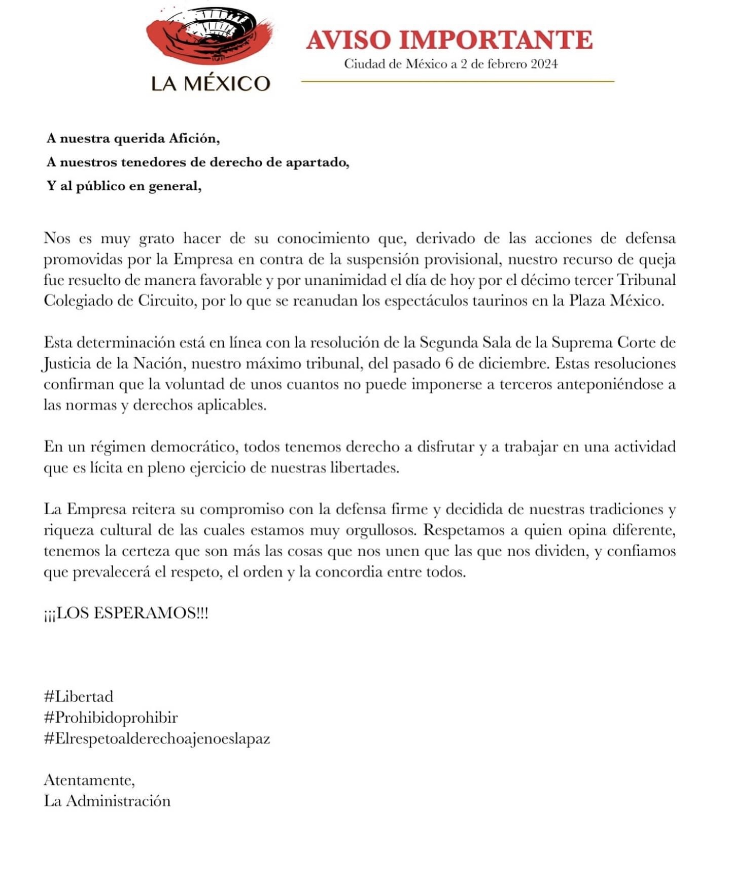 La empresa que administra la Plaza México aseguró que “en un régimen democrático, todos tenemos derecho a disfrutar y a trabajar en una actividad que es lícita en pleno ejercicio de nuestras libertades”