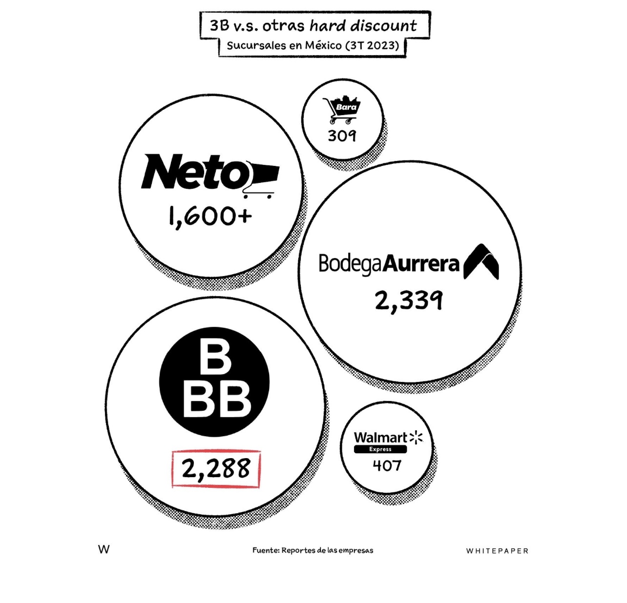 Te anexo una imagen cortesía de Whitepaper donde se muestra el número de tiendas del modelo hard discount.