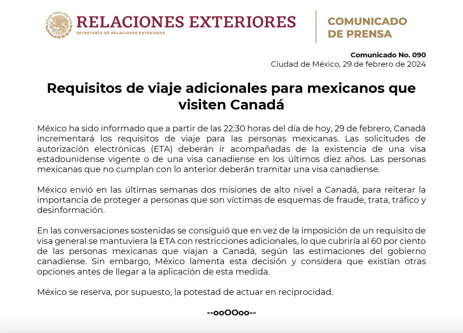 La Secretaría de Relaciones Exteriores informó que en las conversaciones se consiguió que en vez de la imposición de un requisito de visa general se mantuviera la eTA con restricciones adicionales, lo que cubriría al 60 por ciento de los viajeros.