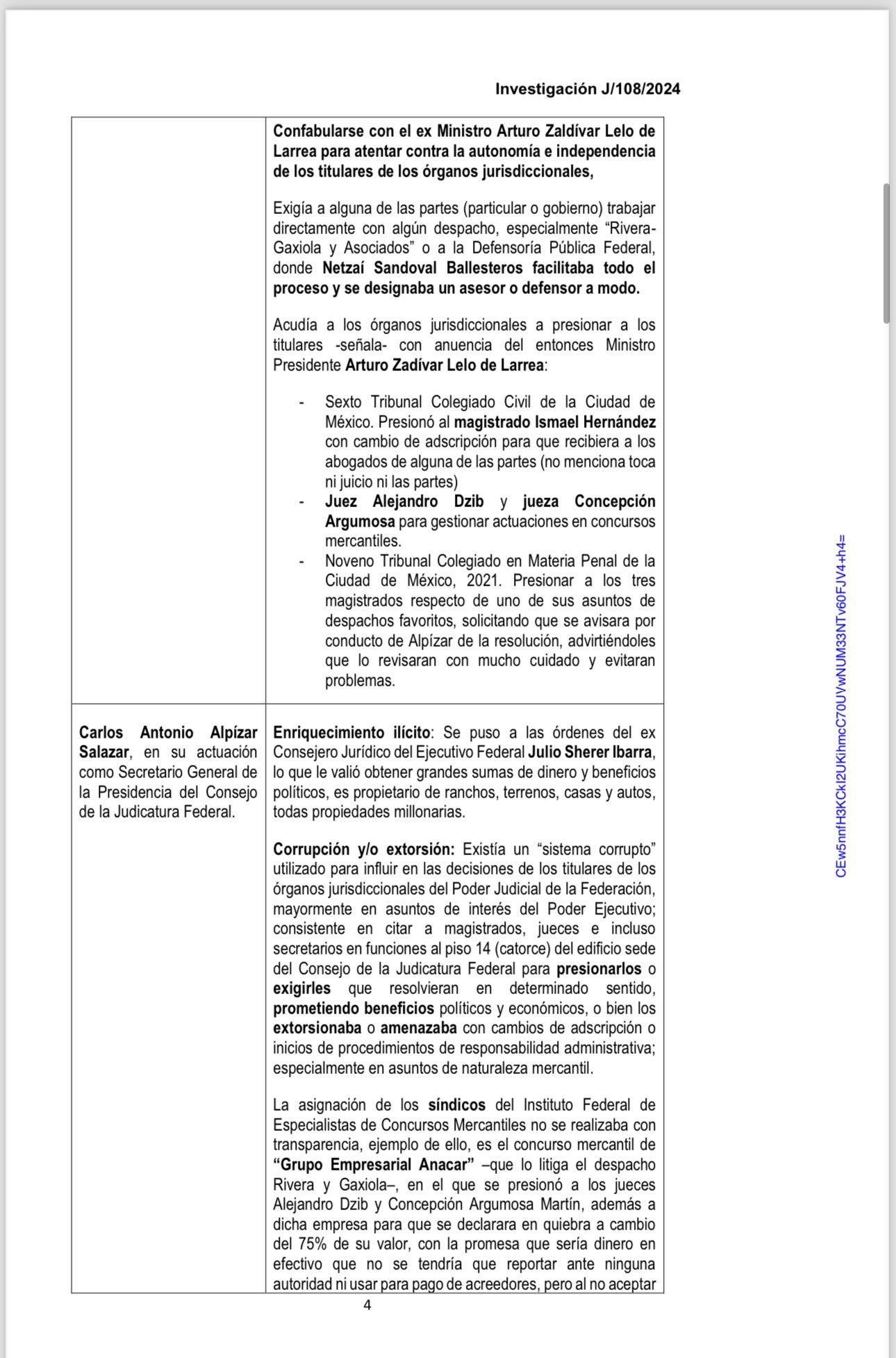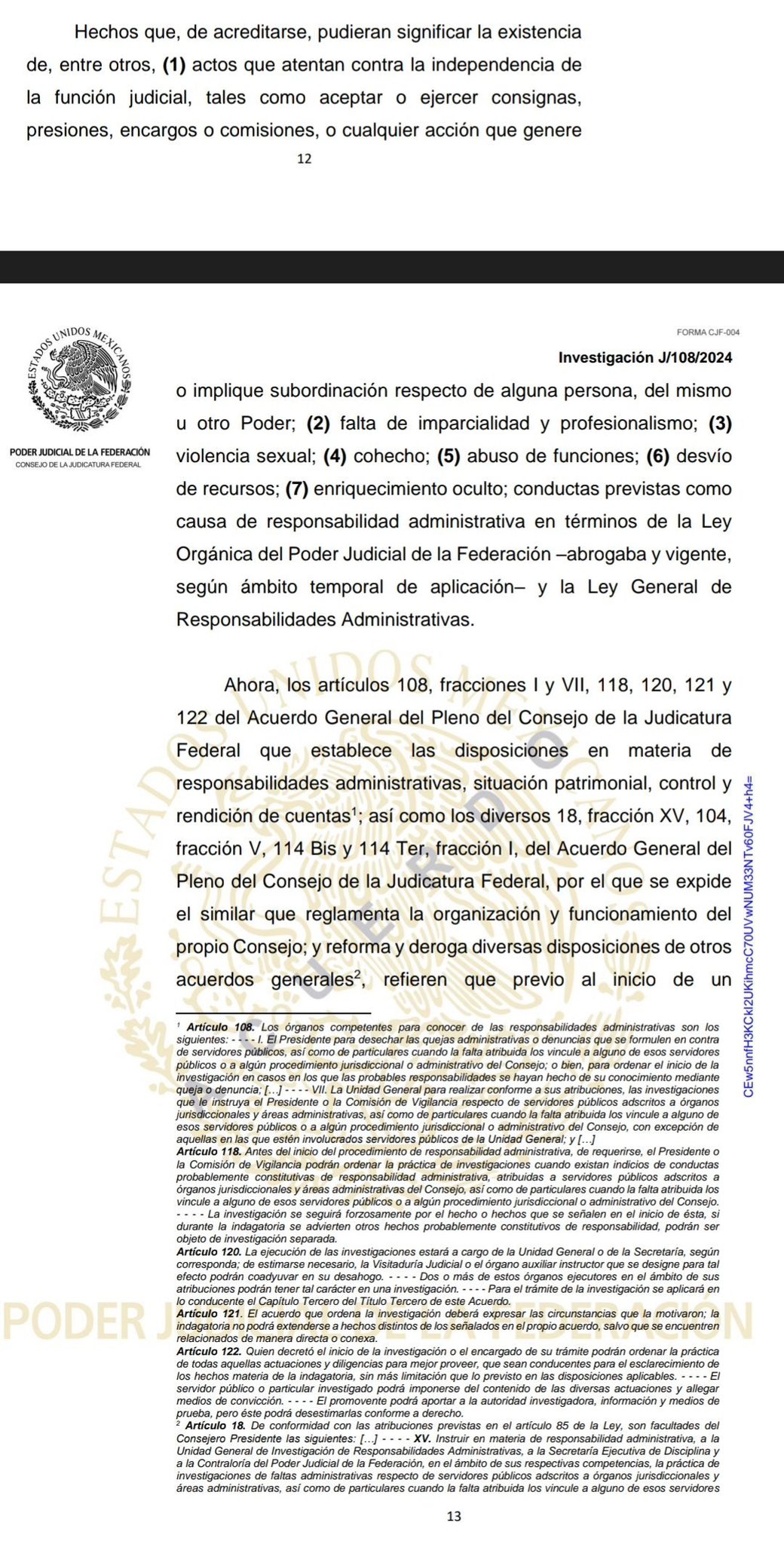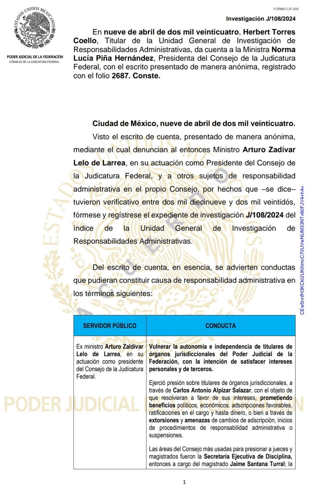En consecuencia, “ante la posibilidad de que los citados funcionarios públicos del Poder Judicial de la Federación, en el desempeño de las funciones propias de los cargos señalados, incurrieran en alguna causa de responsabilidad administrativa por la probable comisión de las conductas descritas con antelación; resulta necesario ordenar la práctica de una investigación a efecto de esclarecer los hechos denunciados”, refiere la denuncia.
