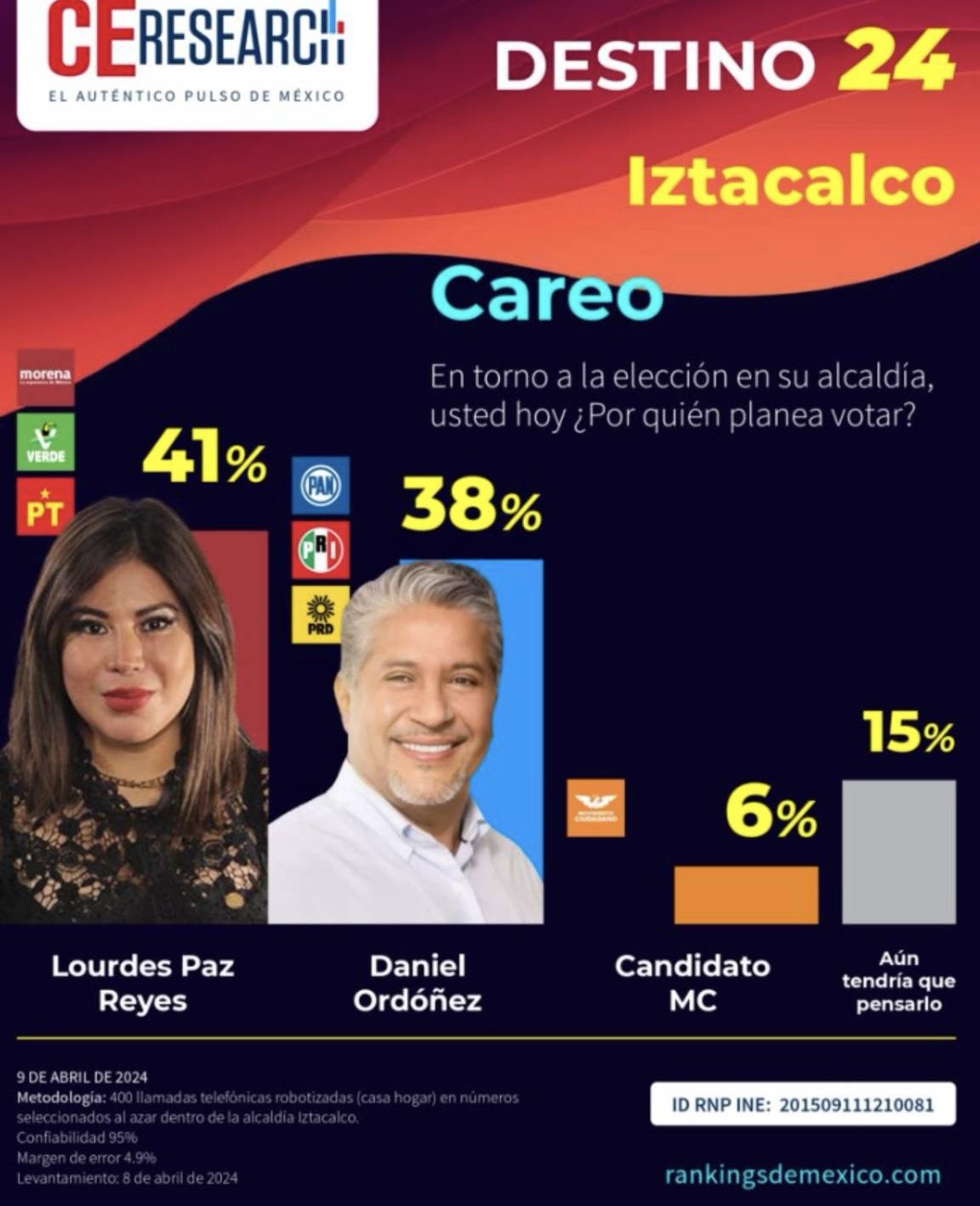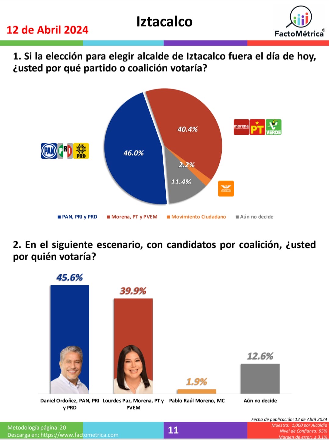 De igual manera, a la pregunta que refiere: “Si la elección para elegir alcalde de Iztacalco fuera el día de hoy, ¿usted por qué partido o coalición votaría?, la respuesta da un 46% a favor de la coalición Va X la CDMX, contra 40.4% de la coalición Morena, PT, Partido Verde.