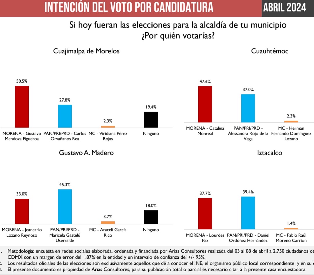 Todas estas encuestas, según sus respectivas empresas, fueron hechas vía telefónica móvil, redes sociales y por técnica de “robot”, con muestras que oscilan entre las 400 y 3000 personas por alcaldía, con niveles de confianza de +-95 por ciento.