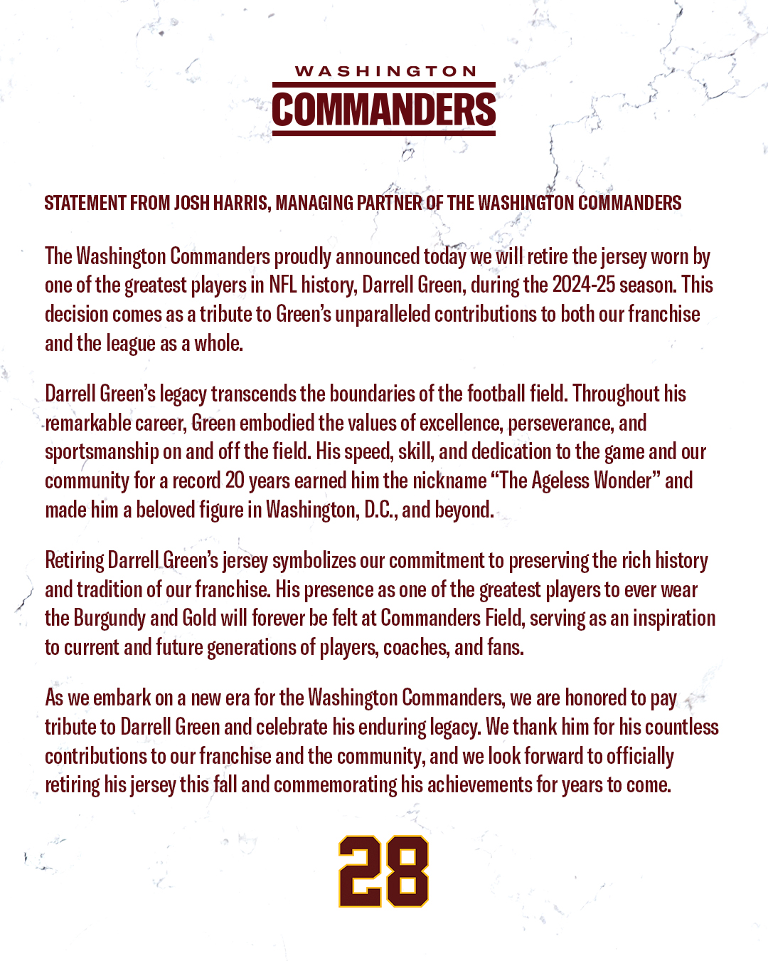 “Los Washington Commanders anunciamos con orgullo que retiraremos la camiseta usada por uno de los mejores jugadores en la historia de la NFL, nadie en nuestro equipo volverá a usar el número 28 de Darrell Green. La decisión es un tributo a sus contribuciones a nuestra franquicia y a la liga”, afirmó Josh Harris, socio director de los Commanders.