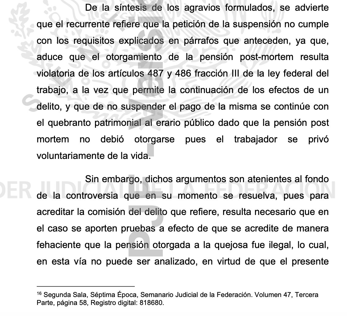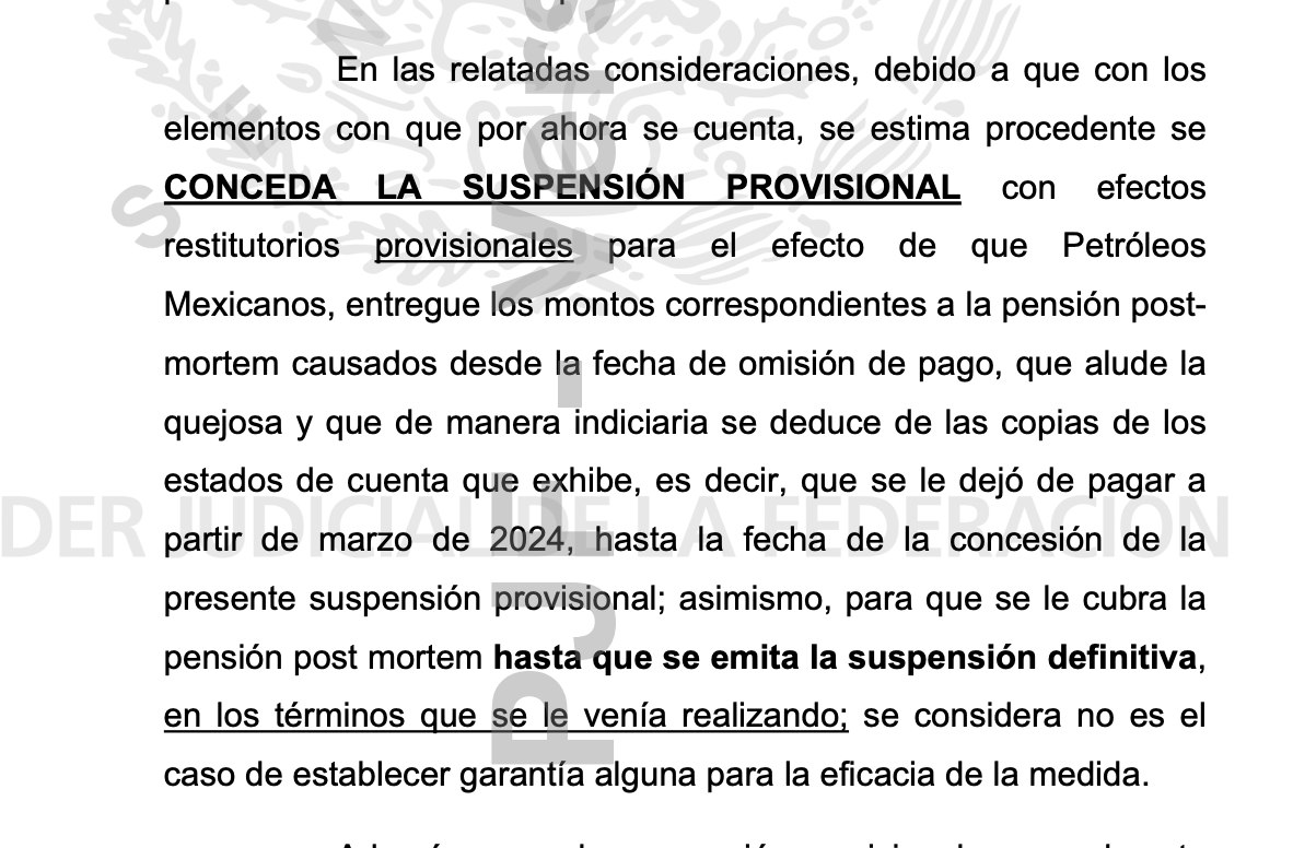 El Sexto Tribunal Colegiado en materia de Trabajo le concedió la suspensión provisional a María Amparo Casar Pérez para que PEMEX le siga pagando la pensión post mortem