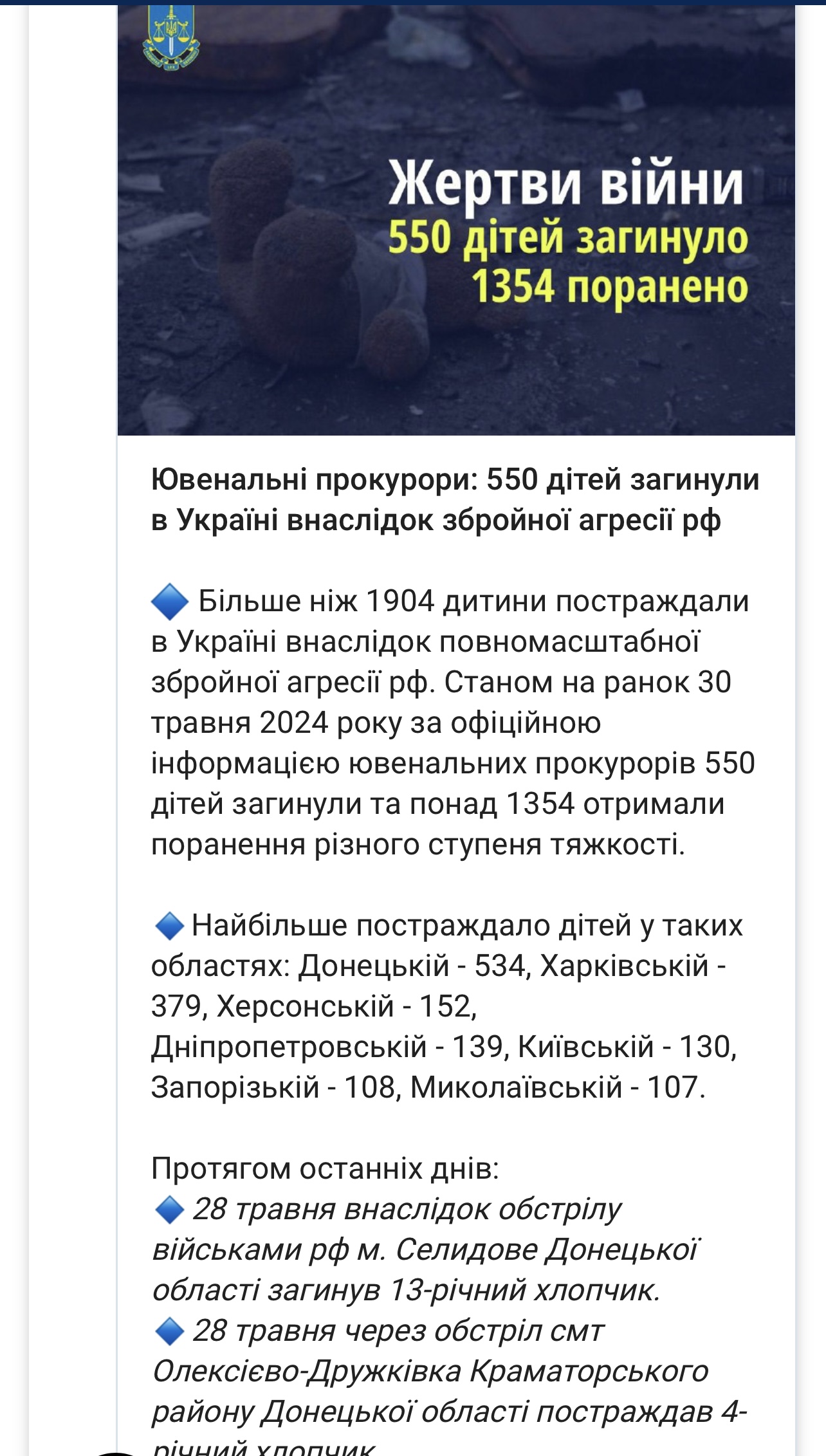 “Hasta la mañana del 30 de mayo de 2024, según la información oficial de los fiscales de menores, 550 niños murieron y más de mil 354 resultaron heridos de diversa gravedad”, escribió en su canal de Telegram la Fiscalía General de Ucrania.