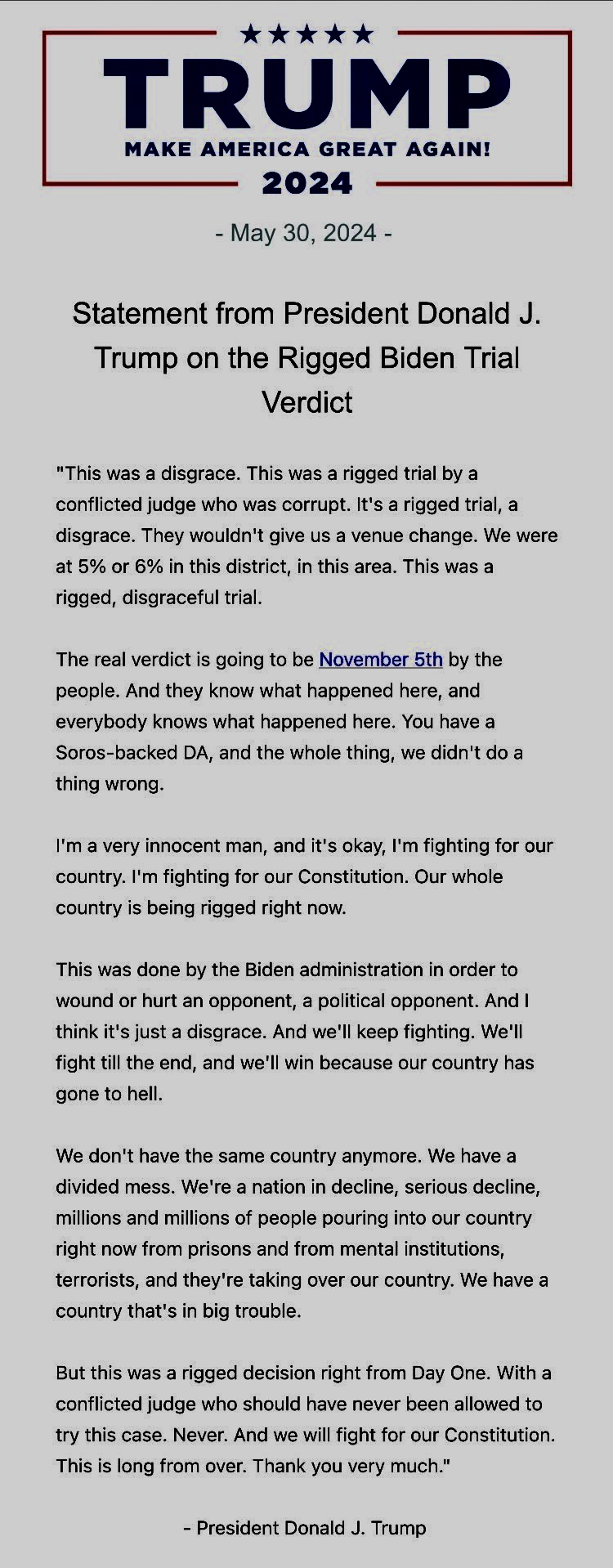 Él siempre ha defendido su inocencia y ha calificado en múltiples ocasiones este proceso como una caza de brujas que busca interferir en su campaña por las presidenciales de noviembre próximo, donde ya es el virtual candidato republicano y se enfrentará al presidente actual, el demócrata Joe Biden.