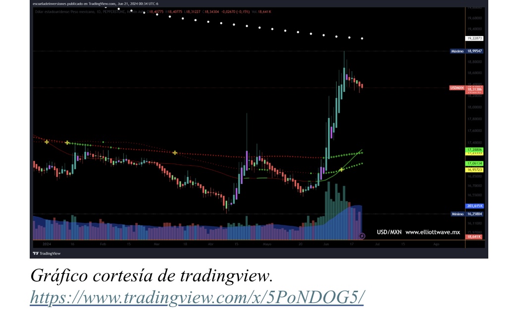 1. El mercado establezca un límite superior, que, según nuestro análisis de datos, podría haber alcanzado los 18.9954 pesos por dólar, o en su defecto, los siguientes niveles clave al alza son 19.2032 y 19.7165.