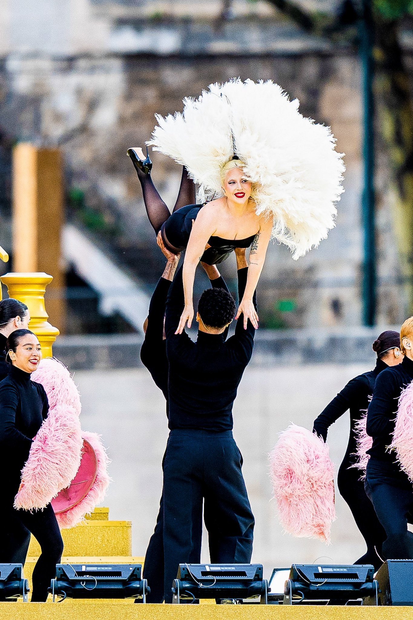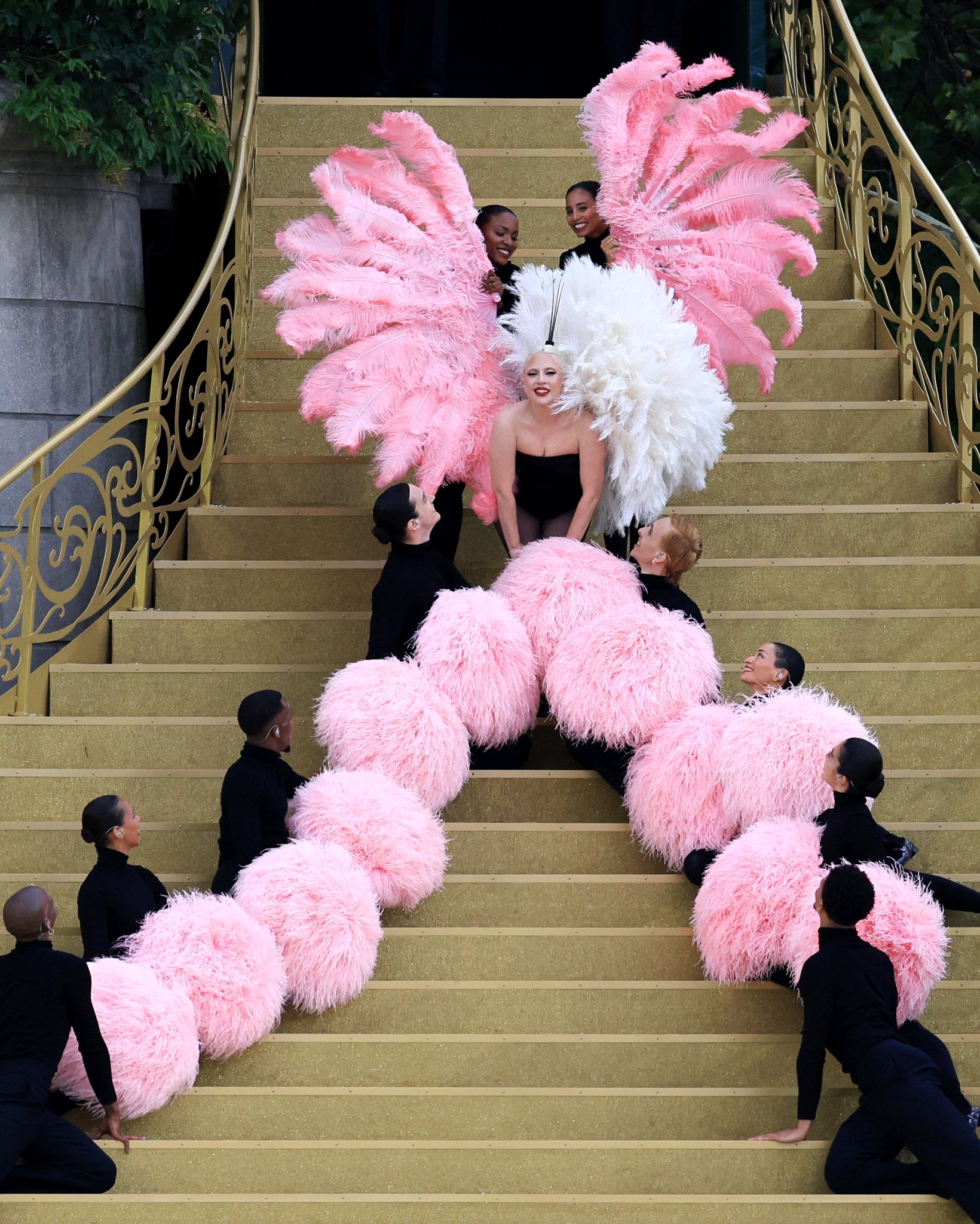 Vestida de negro, la acompañaron una decena de bailarines que portaban pompones rosas y que se encargaron de ocultar la identidad de la artista hasta el momento preciso, ante un público que pasó inmediatamente de la incertidumbre a los aplausos.