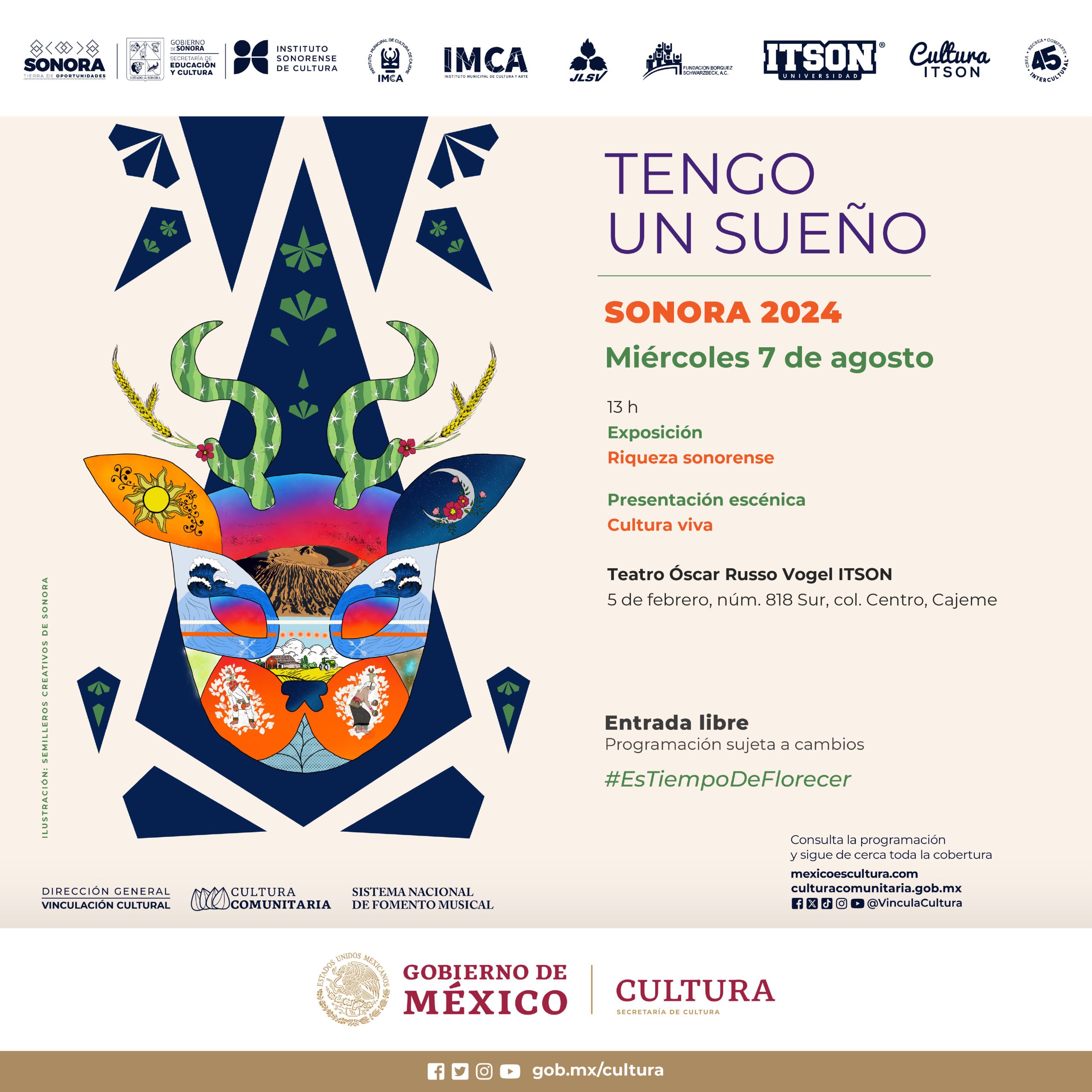 Con el objetivo de generar conexiones e intercambios creativos entre los distintos Semilleros ubicados en el estado, este 7 de agosto, niñas, niños y jóvenes artistas de los Semilleros Creativos llevarán a cabo en el Teatro Dr. Oscar Russo Vogel, en Cajeme, Tengo un sueño Sonora 2024 “Cultura viva”, uno de los 27 eventos estatales en el país que forman parte del Festival Tengo un sueño 2024.