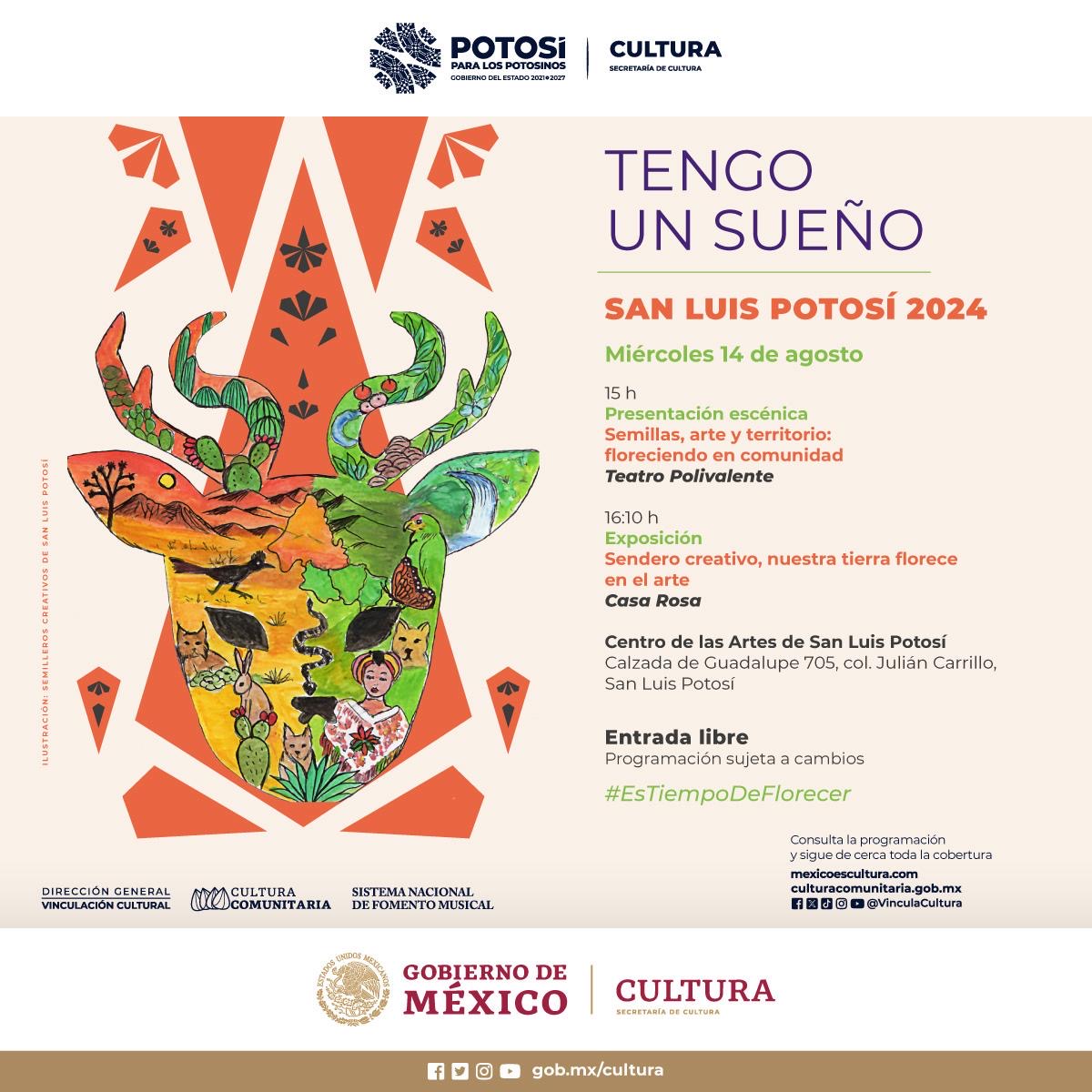 Con el objetivo de generar conexiones e intercambios creativos entre los distintos Semilleros del estado, este 14 de agosto, niñas, niños y jóvenes artistas de los Semilleros Creativos llevarán a cabo en el Centro de las Artes de San Luis Potosí, Tengo un sueño San Luis Potosí 2024 “Semillas, arte y territorio: floreciendo en comunidad “, uno de los 27 eventos estatales en el país que forman parte del Festival Tengo un sueño 2024.