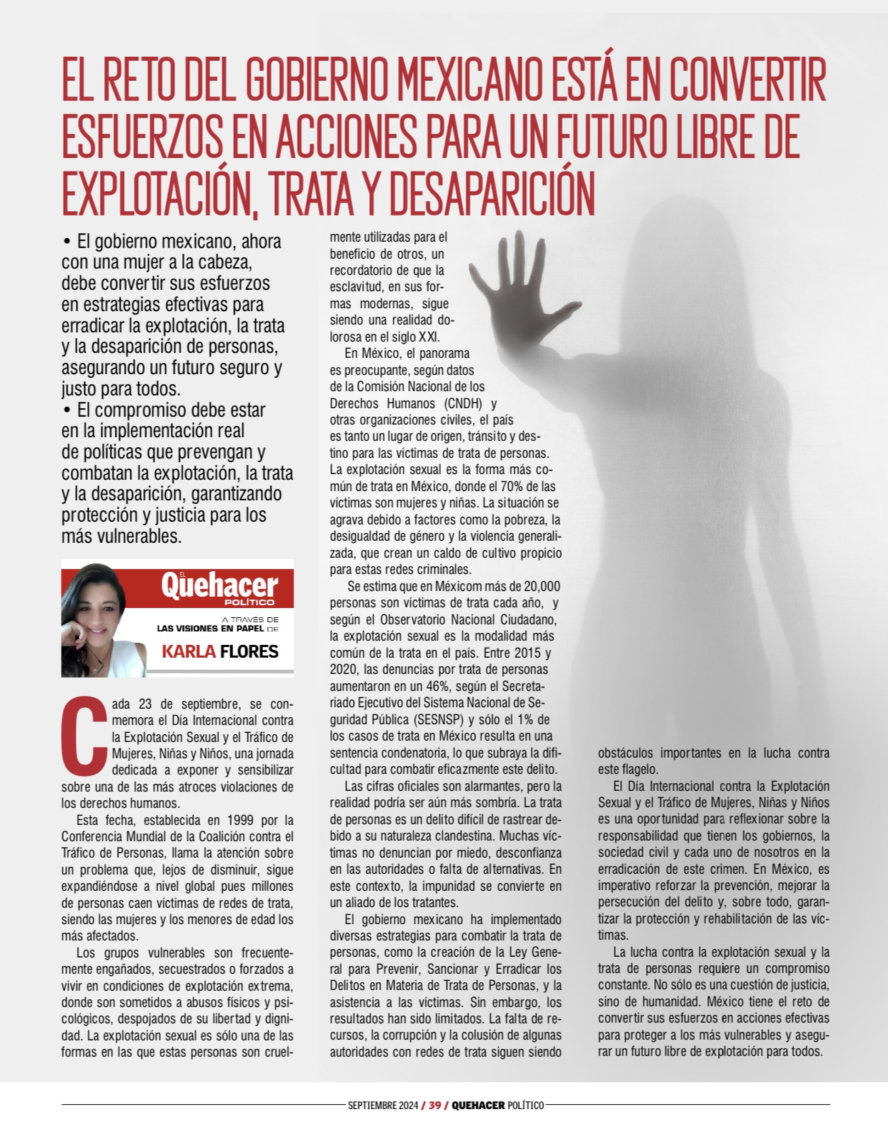 El Quehacer Político a través de las visiones en papel///Karla Flores///El reto del gobierno mexicano está en convertir esfuerzos en acciones para un futuro libre de explotación, trata y desaparición