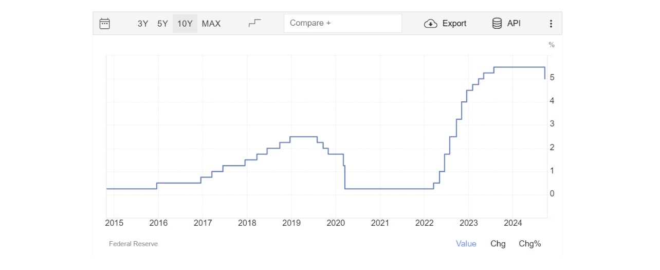 En Estados Unidos, por ejemplo, la tasa de interés subió de 2.5% en diciembre de 2018 a 5.5% en octubre de 2024, un aumento de más del 100%. Este incremento no es menor, y sus efectos son palpables a tal grado que incluso hubo algunos bancos de menor tamaño en Estados Unidos que quebraron, en la última semana del mes de septiembre de 2024 finalmente la Fed ha dado el primer paso para iniciar el ciclo de bajas de tasa de interés. En la siguiente gráfica puedes ver la evolución del costo del dinero en Estados Unidos.