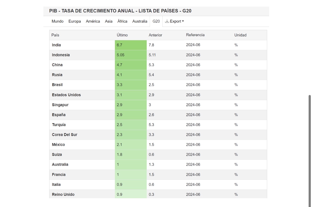 Es relevante recordar que uno de los objetivos del aumento de tasas es enfriar la economía, y en consecuencia, reducir el crecimiento del Producto Interno Bruto (PIB). En los medios de comunicación, es común ver comparaciones sensacionalistas del PIB de este sexenio con el de administraciones anteriores. No obstante, estas comparaciones a menudo ignoran factores clave, como el contexto internacional y el efecto de las políticas monetarias para reducir la inflación. De hecho, economías más grandes, como las del G20 que se muestran en la siguiente tabla, también muestran un crecimiento más lento debido a las políticas de enfriamiento, lo cuál como comentamos en párrafos anteriores podría verse como positivo.