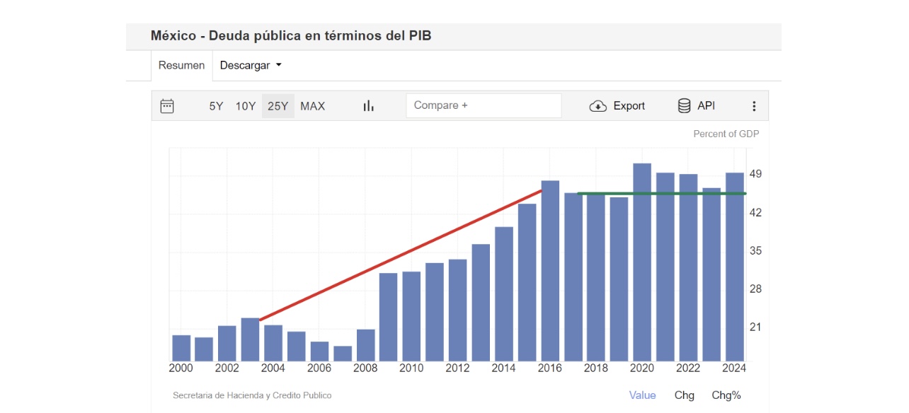La deuda pública no comienza de cero con cada administración; es un legado de políticas y decisiones anteriores, como el FOBAPROA, que aún impactan las finanzas públicas. La clave es observar la estabilidad en el manejo de la deuda durante este sexenio como se muestra en la siguiente gráfica.