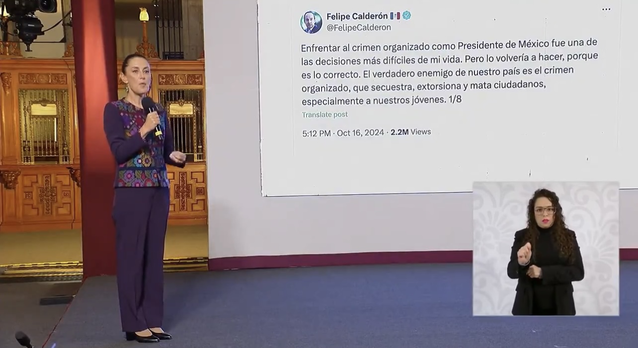 Sheinbaum leyó en su conferencia la publicación en redes de Calderón en la que afirmó que no tenía evidencia que vinculara a su secretario de Seguridad con actividades ilícitas y en donde también reconoce que “mi política de seguridad tuvo aciertos y errores”.