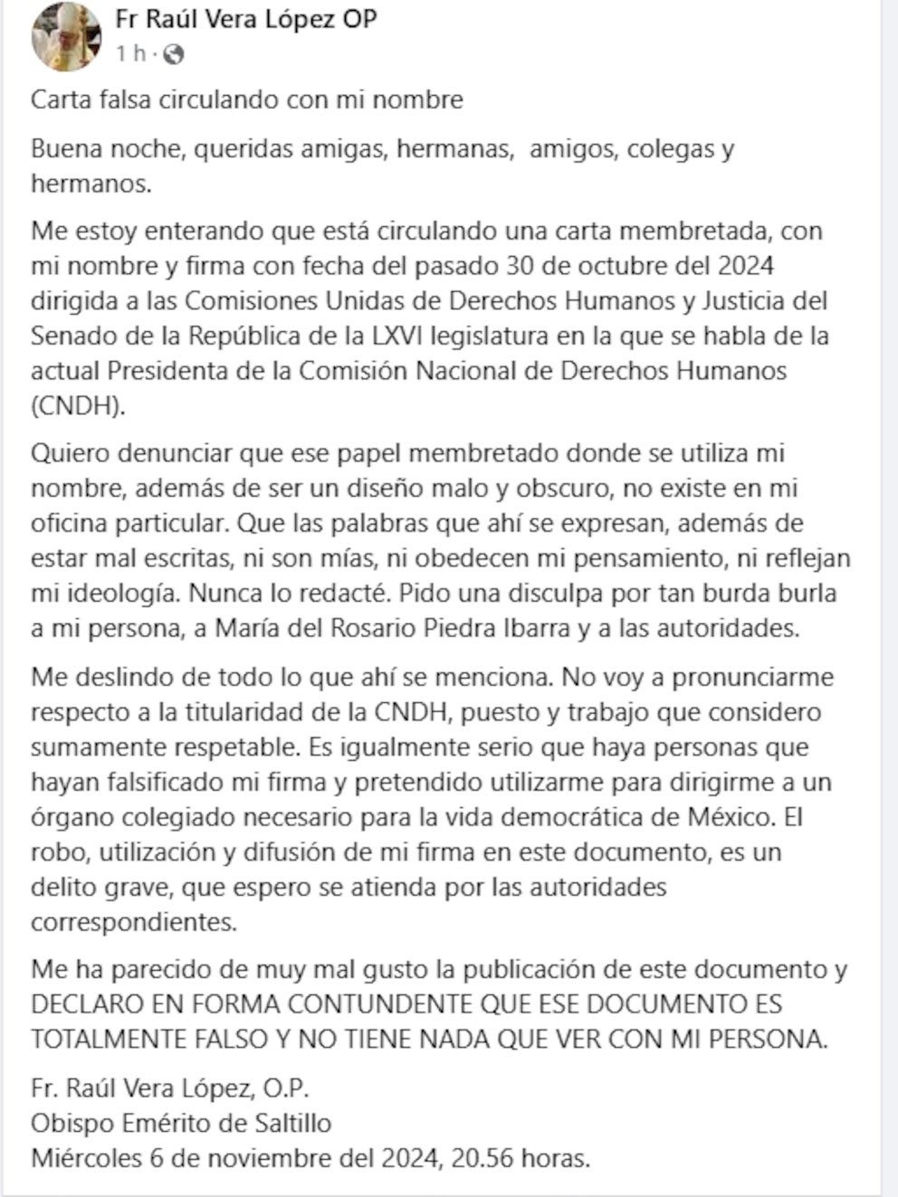 El obispo José Raúl Vera López denunció que es falsa una carta dirigida al Senado de la República membretada con su nombre en apoyo a María del Rosario Piedra Ibarra para continuar al frente de la Comisión Nacional de los Derechos Humanos (CNDH).