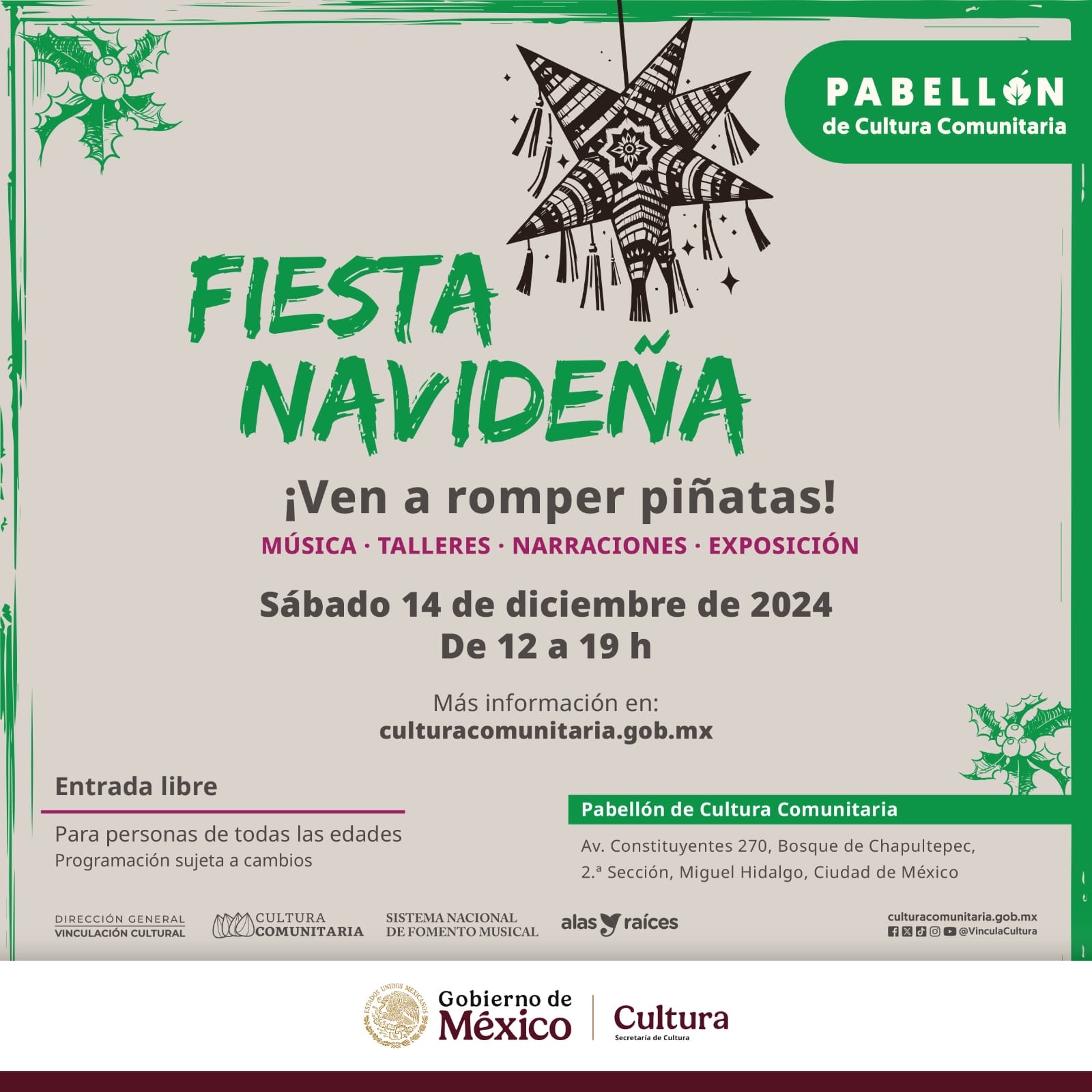 La Secretaría de Cultura del Gobierno de México, a través del programa Cultura Comunitaria, invita a participar en la primera “Fiesta convitera y posada navideña” en el Pabellón de Cultura Comunitaria, que se llevarán a cabo el próximo sábado 14 de diciembre de 2024.