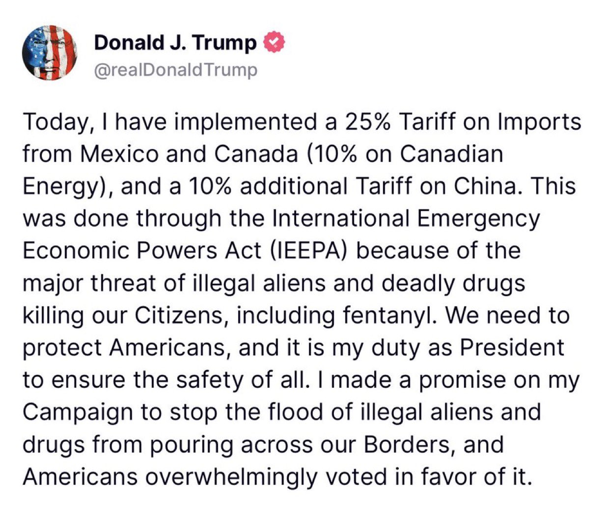 Trump afirmó, a través de un comunicado difundido por la Casa Blanca, que esta alianza entre las organizaciones criminales y el gobierno mexicano pone en riesgo la seguridad nacional de Estados Unidos, y por ello, se impuso un arancel del 25% a los productos de México, así como a los de Canadá y China.