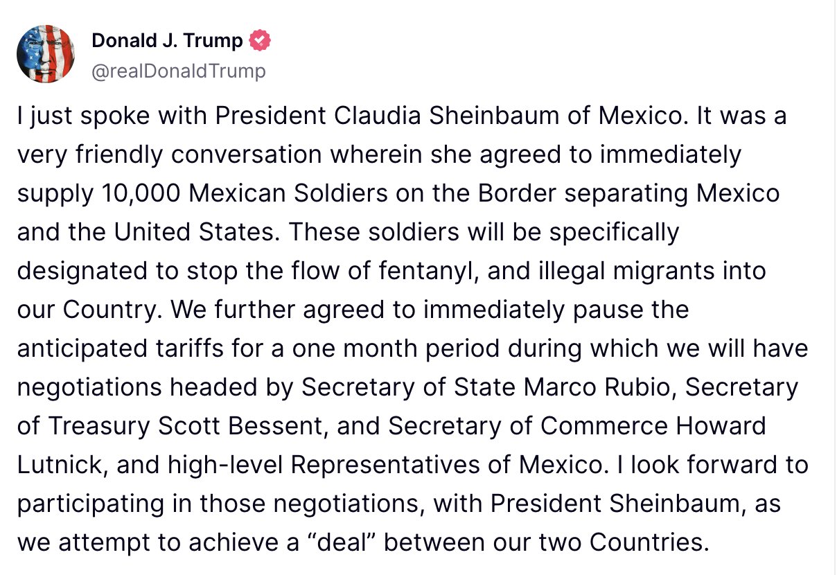 El presidente estadounidense confirmó que se acordó “suspender inmediatamente los aranceles previstos durante un periodo de un mes, durante el cual tendremos negociaciones encabezadas por el secretario de Estado, Marco Rubio, el secretario del Tesoro, Scott Bessent, y el secretario de Comercio, Howard Lutnick, y representantes de alto nivel de México”.