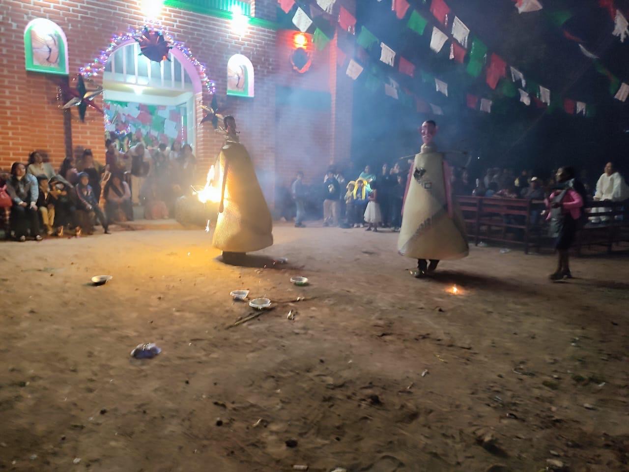 La danza representa a un hombre y una mujer de gran tamaño, tallados en madera y recubiertos con petates de palma. La mujer lleva un rebozo negro y el hombre un sombrero y gabán de lana, que reflejan la identidad local. En la danza final, ambos se encuentran mientras la pirotecnia artesanal en sus cuerpos ilumina el espectáculo.