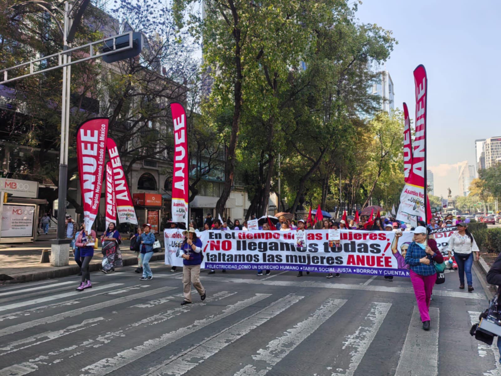 Las mujeres participantes en la Asamblea Nacional de Usuarios de Energía Eléctrica (ANUEE) marchan el 3 de marzo del 2025 con sus compañeros de lucha, del edificio rojo de la Comisión Federal de Electricidad (CFE) a Palacio Nacional (Zócalo CDMX) consideramos que la lucha social, popular y pacífica, no es de géneros, es de clases; acción en el marco del 8M para decirle a la presidenta Dra. Claudia Sheinbaum Pardo que en el llamado “tiempo de las mujeres” ¡no llegamos todas! faltamos las mujeres de la ANUEE, ya que nos sentimos excluidas en virtud de que nuestra solicitud y demandas no han sido resueltas, por tal razón nos movilizamos para demandar/solicitar: