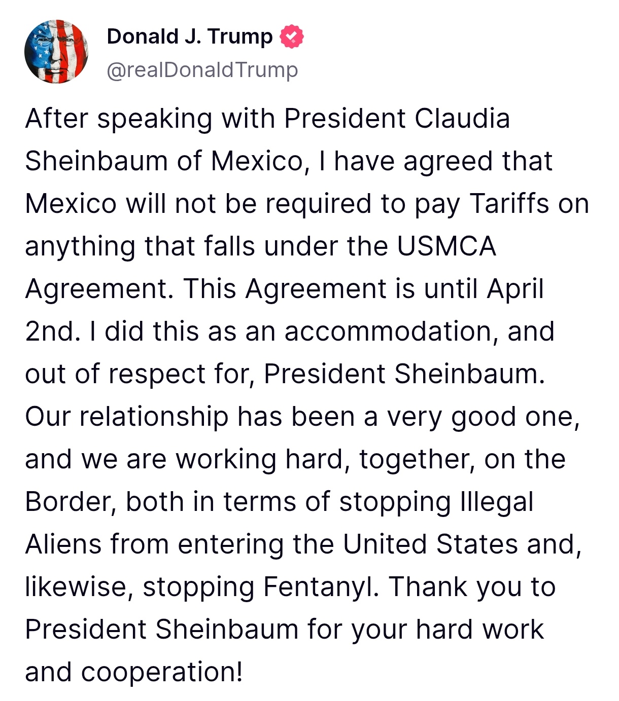 El presidente de Estados Unidos, Donald Trump, informó este jueves que acordó con su homóloga mexicana Claudia Sheinbaumexentar los aranceles a todos los productos del T-MEC, hasta el 2 de abril.