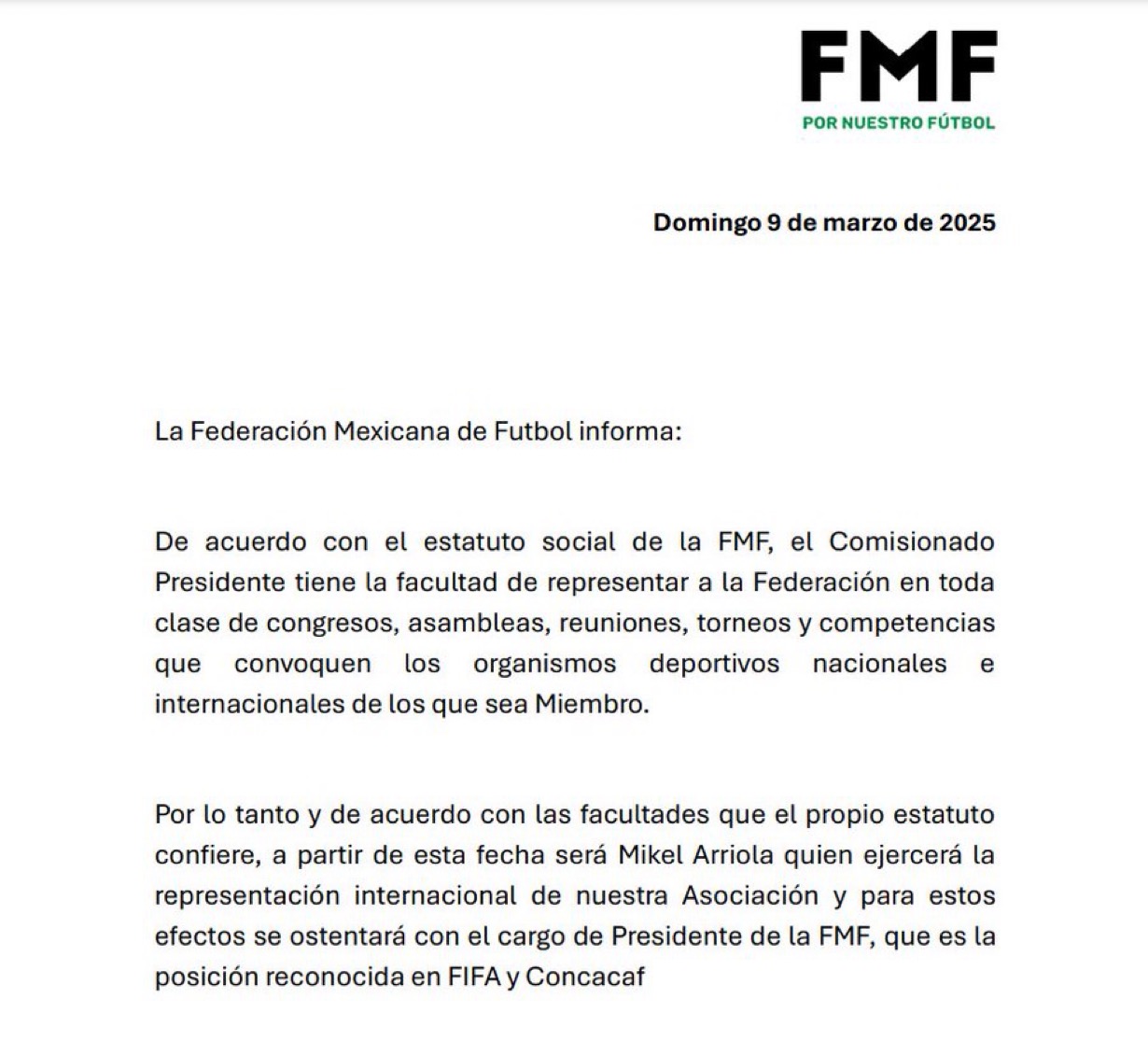 Después de dar ese antecedente, la Federación agregó que, de acuerdo con las facultades que el estatuto concede, a partir de esta fecha Arriola ejercerá la representación internacional de la asociación y para esos efectos ostentará el cargo de presidente, que es la posición reconocida en la FIFA y la Concacaf.