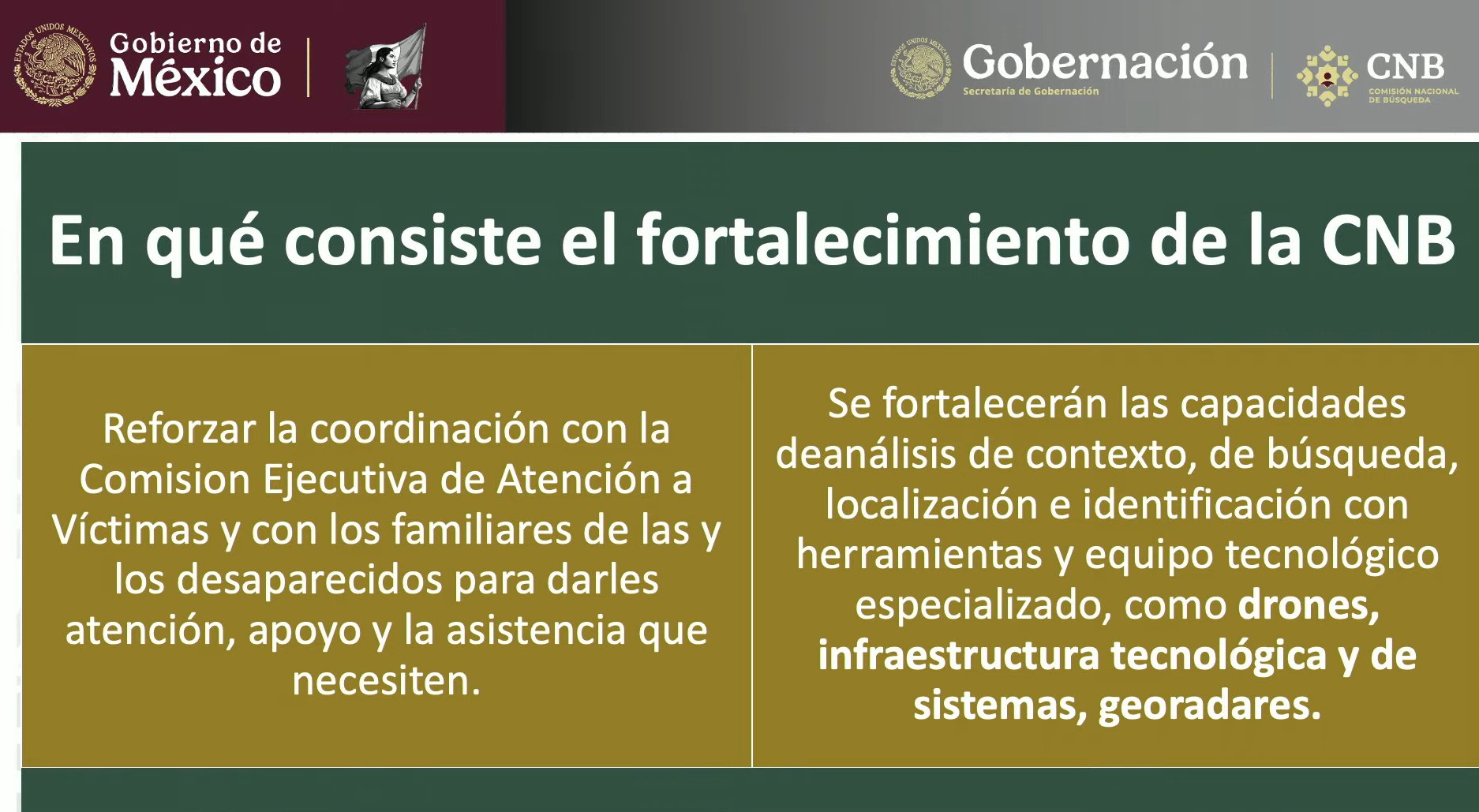 “Se van a fortalecer las capacidades de la Comisión Nacional de Búsqueda con más personal, con mayor tecnología para ser más eficaces y eficientes los procesos de búsqueda ya existentes y los nuevos que se vayan presentando en búsquedas en vida o también en búsquedas forenses”, señaló Félix Arturo Medina Padilla, subsecretario de Derechos Humanos, Población y Migración.