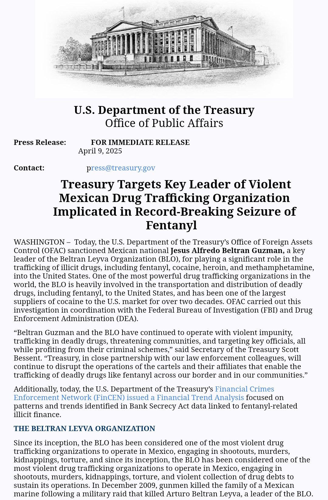“El Tesoro, en estrecha colaboración con nuestros colegas encargados de cumplir la ley, continuará interrumpiendo las operaciones de los carteles y sus afiliados que permiten el tráfico de drogas mortales como el fentanilo a través de nuestra frontera y en nuestras comunidades”, dijo el secretario, Scott Bessent.