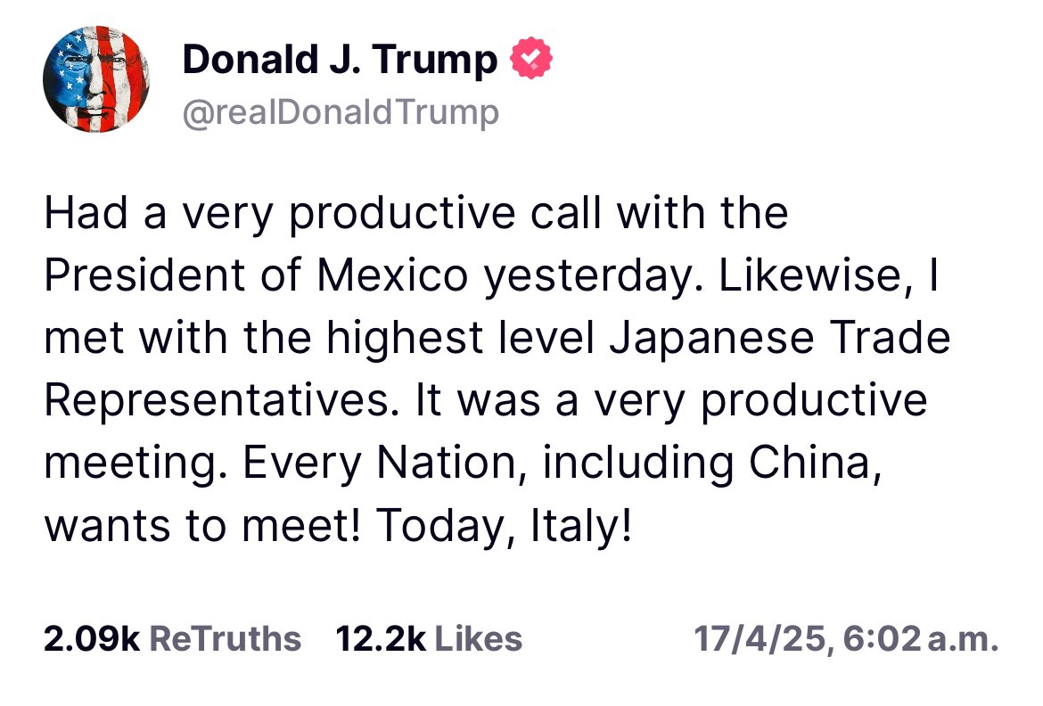 “Ayer tuve una conversación muy productiva con la Presidenta de México. Asimismo, me reuní con los representantes comerciales japoneses del más alto nivel. Fue una reunión muy productiva. ¡Todas las naciones, incluida China, desean reunirse! ¡Hoy, Italia!”, dijo en su red social, Truth Social.