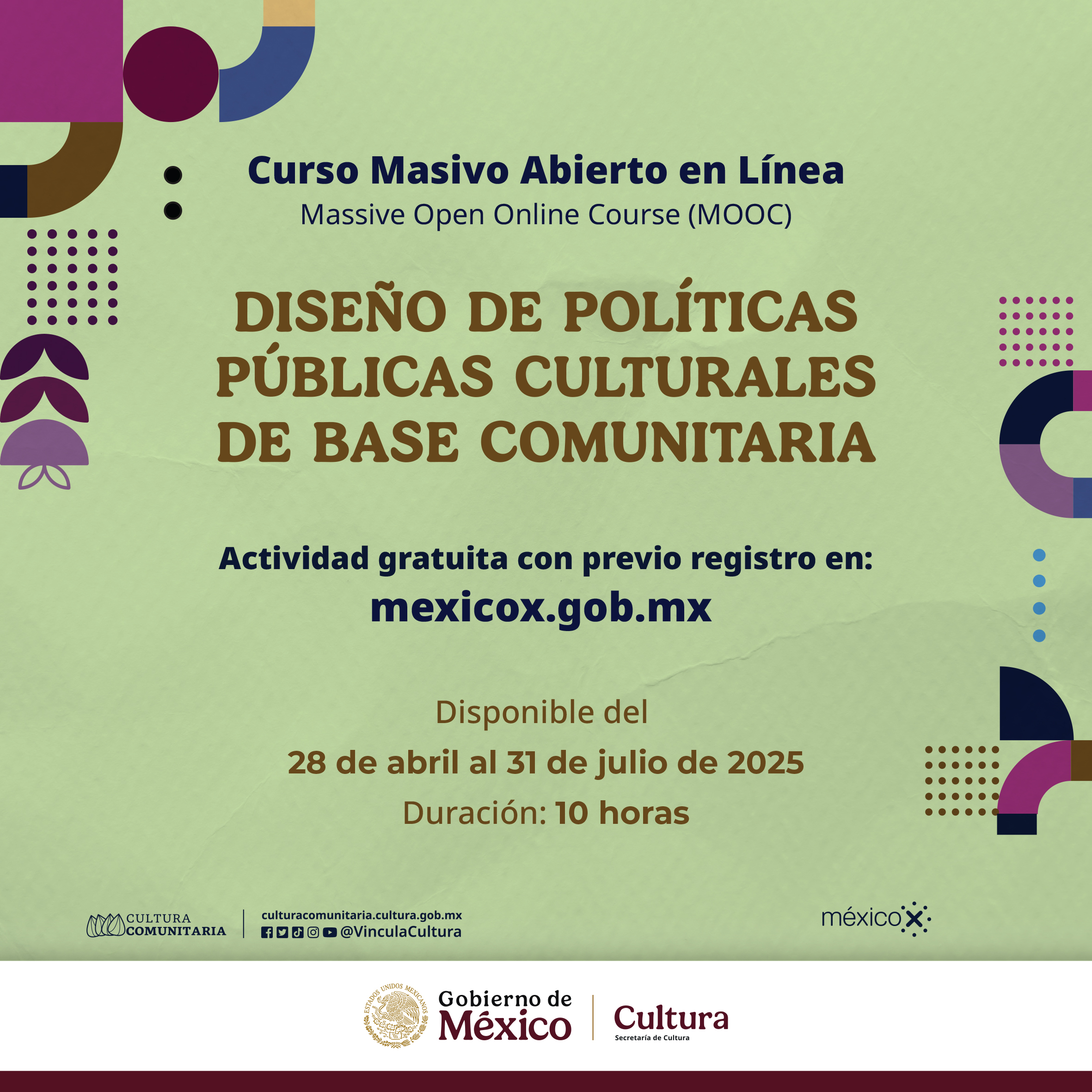 La Dirección General de Vinculación Cultural de la Secretaría de Cultura del Gobierno de México invita a personas interesadas en la gestión y promoción cultural comunitaria a participar en una nueva edición del curso masivo abierto en línea (MOOC, por sus siglas en inglés) “Diseño de políticas públicas culturales de base comunitaria”, disponible hasta el 31 de julio de 2025 en la plataforma MéxicoX.
