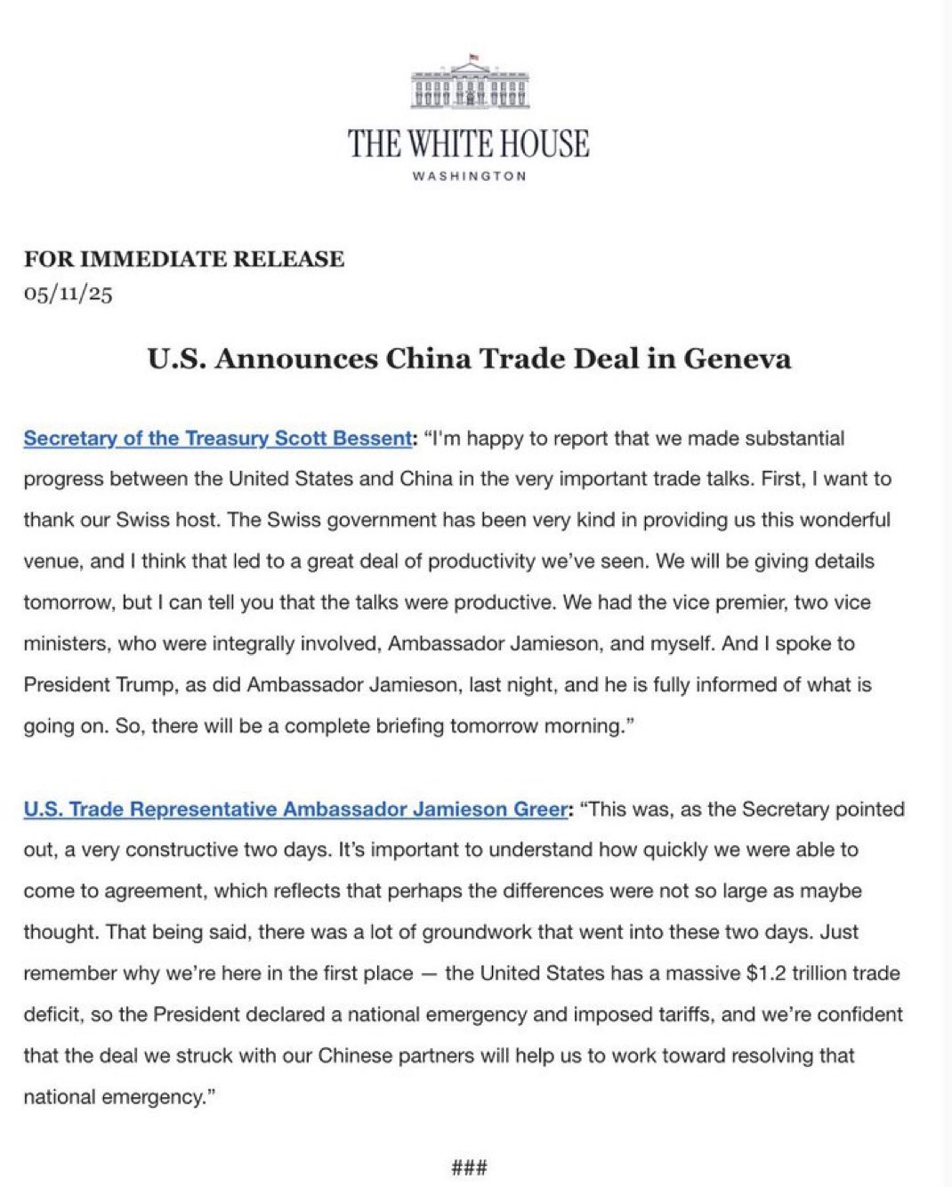 Pekín y Washington anunciaron este lunes en un comunicado conjunto que China reducirá del 125% al 10% los aranceles sobre productos estadounidenses durante los próximos 90 días y Estados Unidos hará lo propio desde el 145% al 30% para los bienes chinos, como parte de los términos acordados para frenar la “guerra comercial” desatada este año por Trump.