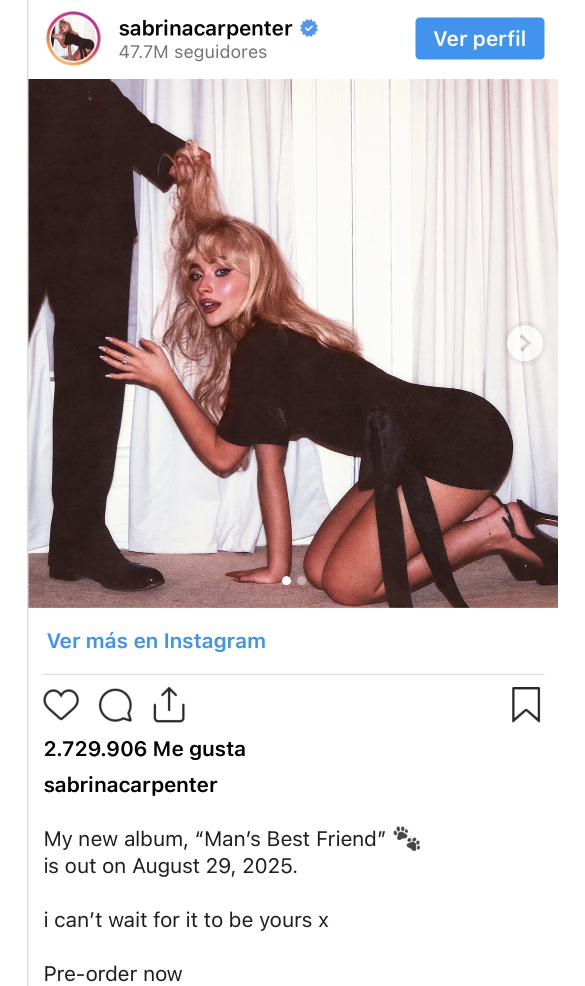 A través de redes sociales, la también actriz hizo público el anuncio. “Mi nuevo álbum, Man’s Best Friend, sale el 29 de agosto de 2025. No puedo esperar a que sea suyo!”, posteó.