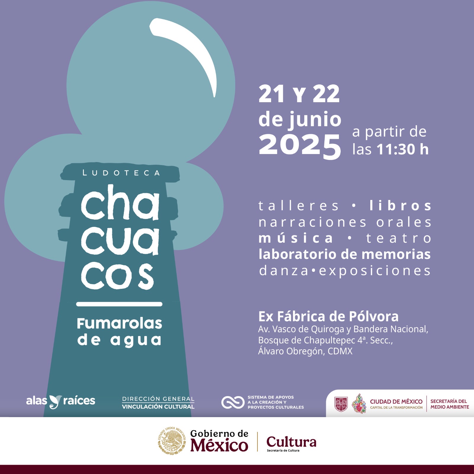 Bajo los principios del ejercicio pleno de los derecho culturales y ambientales, la Secretaría de Cultura del Gobierno de México, a través de la Dirección General de Vinculación Cultural, el Sistema Creación y la Coordinación Nacional de Desarrollo Cultural Infantil – Alas y Raíces, en colaboración con la Secretaría de Medio Ambiente (Sedema) del Gobierno de la Ciudad de México, arranca actividades, el próximo sábado 21 de junio de 2025, la Ludoteca “Chacuacos, fumarolas de agua”, que beneficia a la comunidad que habita y visita la zona poniente de la capital del país.