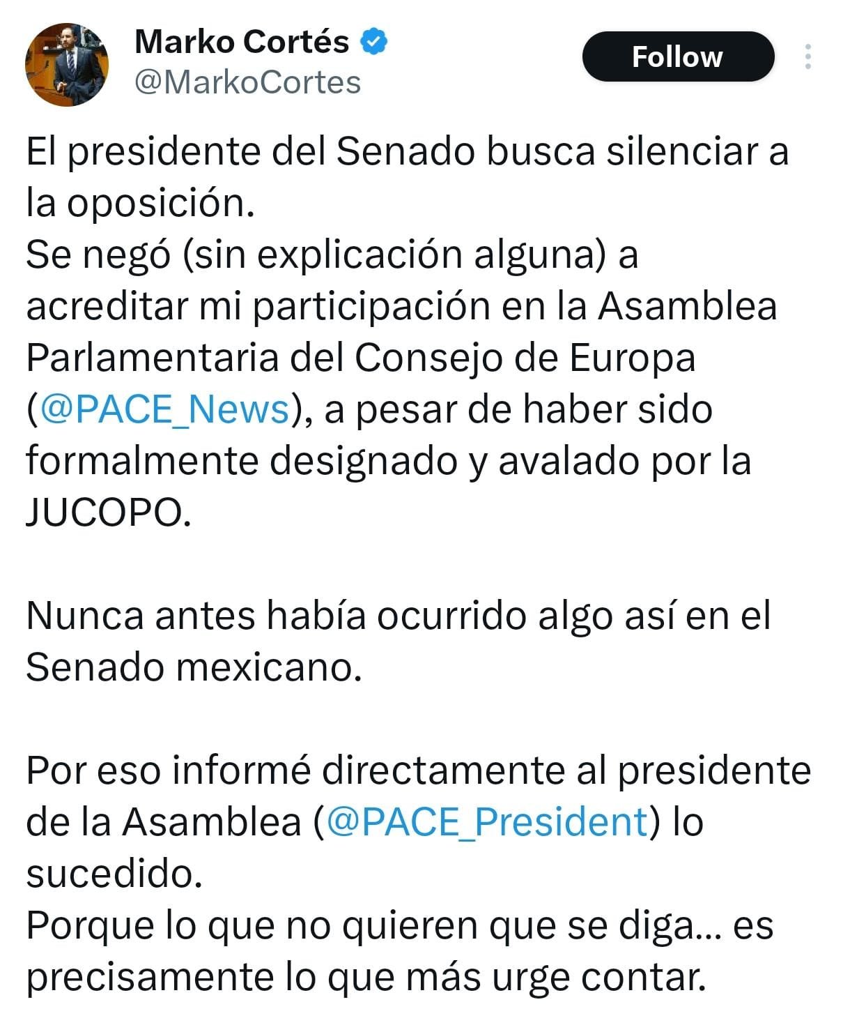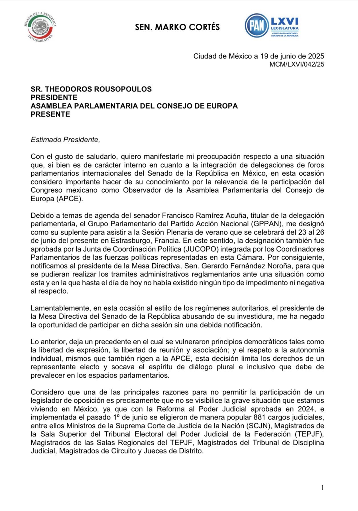 Por su parte, Marko Cortés publicó una carta dirigida a TheodorosRoussopoulos, presidente de la APCE, en la que señalaba que Fernández Noroña “abusó de su investidura como presidente de la Mesa Directiva” y leimpidió participar en la Sesión Plenaria de verano.