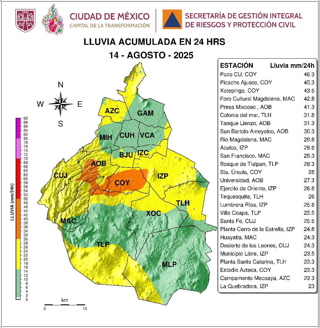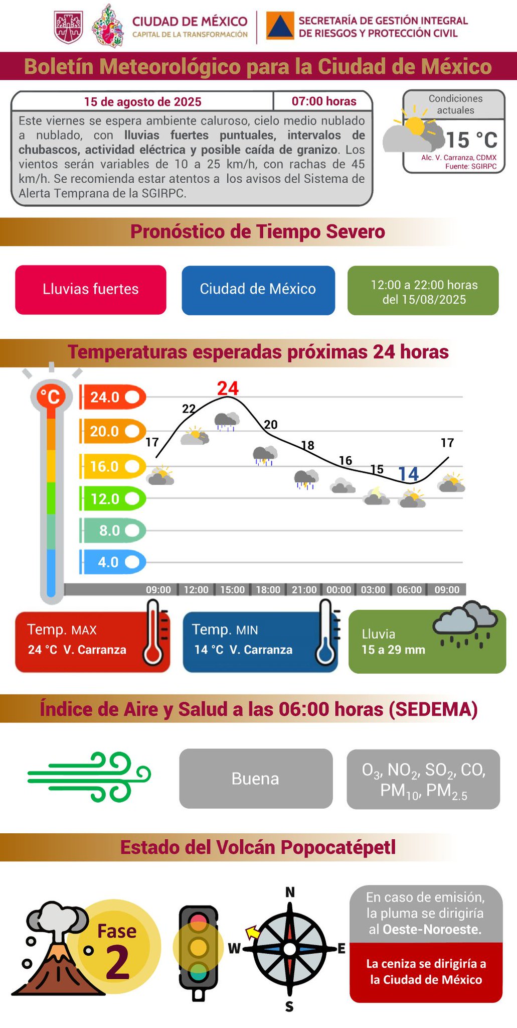La Secretaría de Gestión Integral de Riesgos y Protección Civil (SGIRPC) informó con un boletín en redes sociales que hoy viernes 15 de agosto de 2025 la Ciudad de México (CDMX) tendrá condiciones de clima inestables, con lluvias fuertes puntuales, intervalos de chubascos, actividad eléctrica y posible caída de granizo.