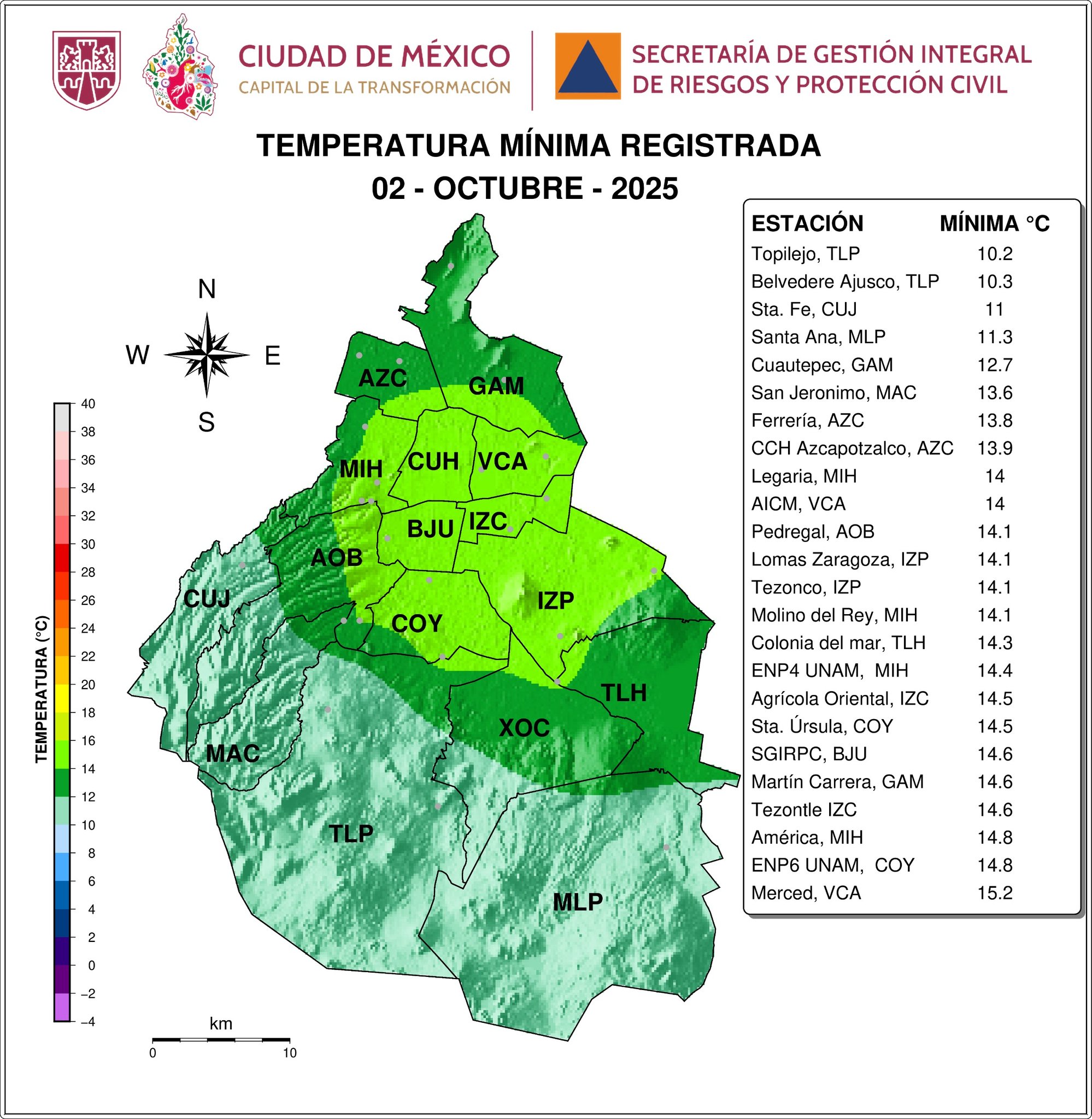 Se pronostica que las temperaturas mínimas oscilen entre 10 y 13 °C, siendo más fresca hacia el sur y oeste, en delegaciones como Cuajimalpa, sur de Álvaro Obregón, Tlalpan, Milpa Alta y La Magdalena Contreras, y fría a fresca en el resto de la ciudad.