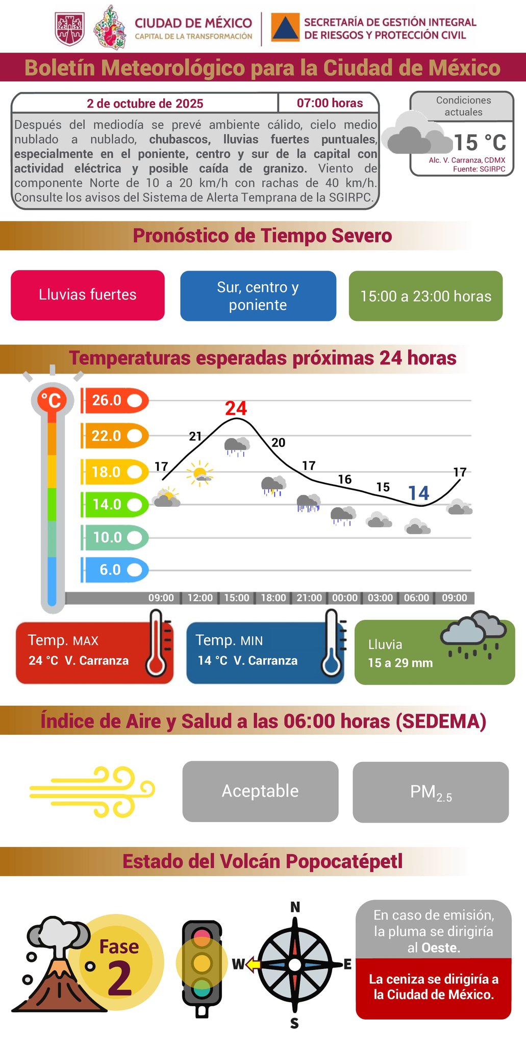 La Secretaría de Gestión Integral de Riesgos y Protección Civil (SGIRPC) informó que este martes,1 de octubre, se prevén lluvias fuertes con probabilidad de granizo en CDMX