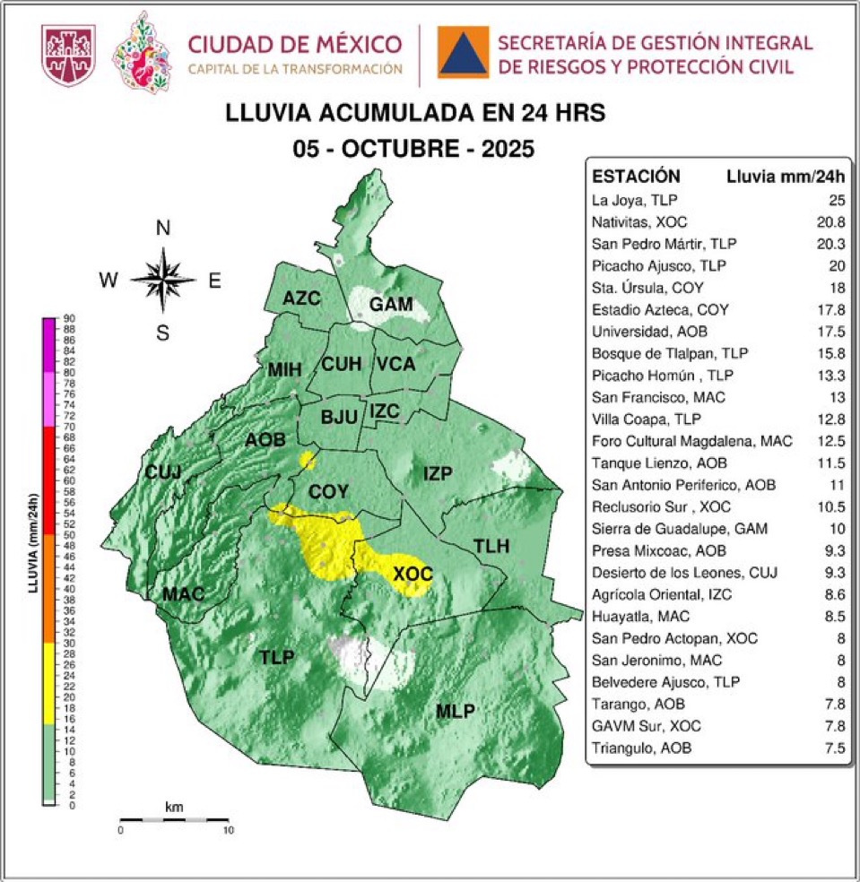 En Ciudad de México (CDMX), se pronostica probabilidad de chubascos y lluvias puntuales fuertes acompañadas de descargas eléctricas. Dichas lluvias podrían presentarse con fuertes rachas de viento y originar incremento en los niveles de ríos y arroyos, deslaves, inundaciones, encharcamientos y visibilidad reducida.