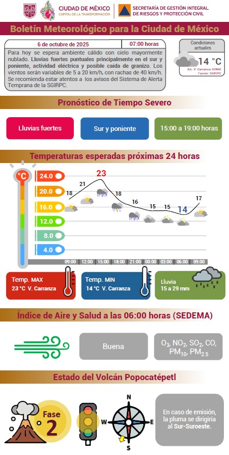 De acuerdo con el pronóstico del tiempo del Servicio Meteorológico Nacional (SMN), el día de hoy, 6 de octubre, un canal de baja presión en el interior de la República Mexicana, en combinación con la entrada de aire húmedo del océano Pacífico y el golfo de México, propiciará lluvias puntuales fuertes en Tlaxcala, Morelos, Ciudad de México y Estado de México.