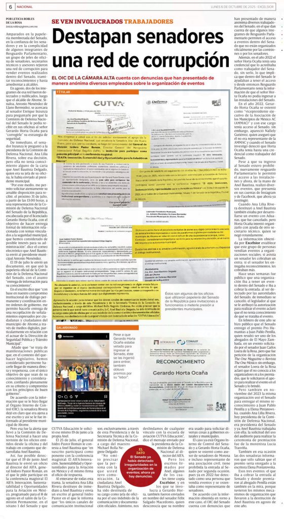 Así, fue posible detectar que el 19 de junio Anel Bautista le envió un oficio al director del AIFA, general Isidoro Pastor Román, en el que le pide participar en la conferencia magistral El AIFA: Innovación, Sustentatabilidad y Oportunidades para la Aviación en México, programado para el 8 de agosto en el salón de la Comisión Permanente, en el sótano 1 del Senado y que CUTVA Educación le solicitó ese mismo 19 de junio a la propia Anel.