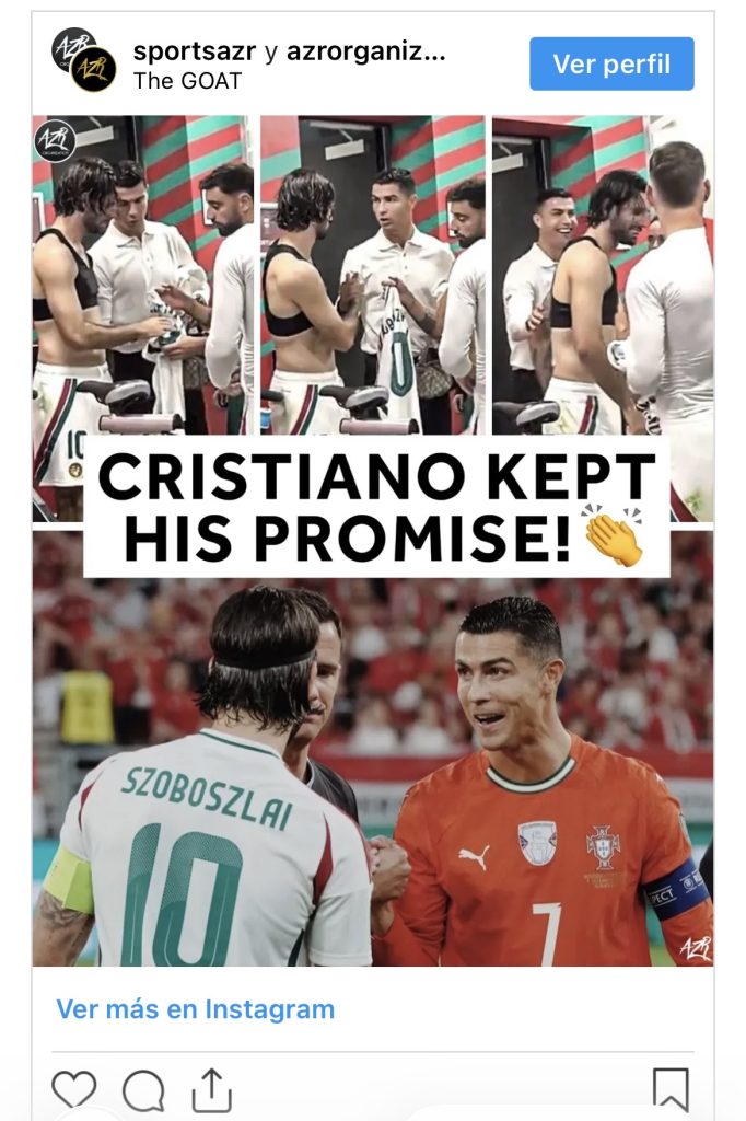 Pese a haber metido los dos goles de Portugal, se pensaba que, con la decepción del momento, a Cristiano se le olvidaría cumplir con su promesa. Pero no fue así. Al finalizar el encuentro fue a buscar a Szoboszlai a los vestidores para entregarle en sus manos la playera.