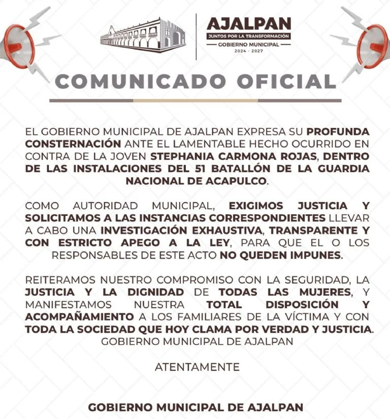 Un día después del asesinato de la joven Stephania Carmona, el gobierno municipal de Ajalpan, de donde es originaria, expresó su profunda consternación por el caso y exigió justicia, así como una investigación exhaustiva, transparente y con estricto apego a la ley.