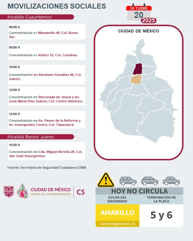 De acuerdo a La Secretaría de Seguridad Ciudadana (SSC) estas son las marchas, concentraciones y rodadas programadas para este viernes 17 de octubre de 2025: