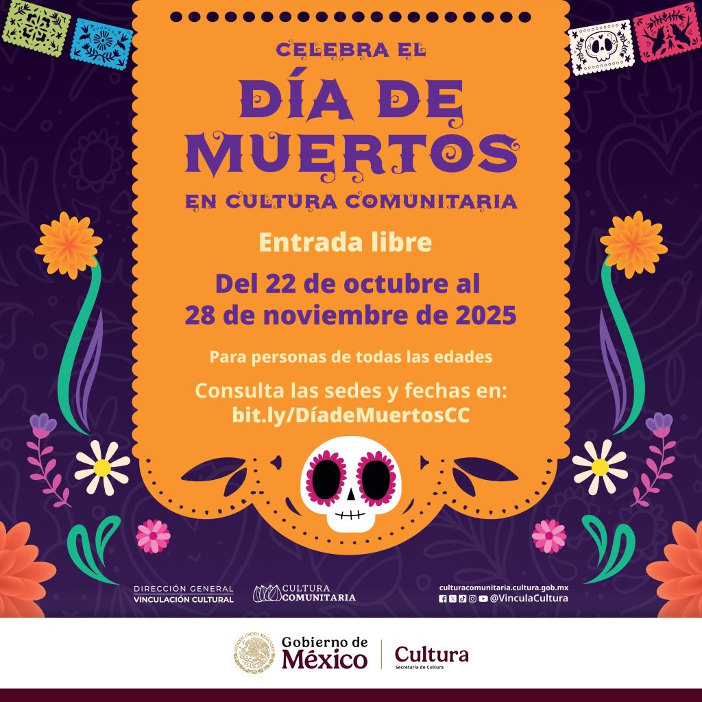 En el marco de la celebración del Día de Muertos, el programa Cultura Comunitaria de la Secretaría de Cultura del Gobierno de México te invita a disfrutar de múltiples actividades gratuitas que tiene preparadas para ti del 22 de octubre al 28 de noviembre de 2025.