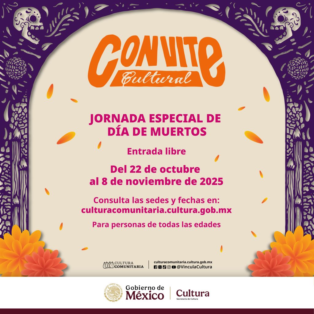 Por su parte, los Convites Culturales –espacios de encuentro que promueven la participación artística y cultural– celebrarán el Día de Muertos con 107 jornadas especiales en 19 estados, en donde se realizan diversas acciones simbólicas y participativas como la elaboración de altares comunitarios, procesiones, desfiles y anecdotarios, reconociendo la riqueza cultural de las comunidades y la importancia del trabajo colaborativo.
